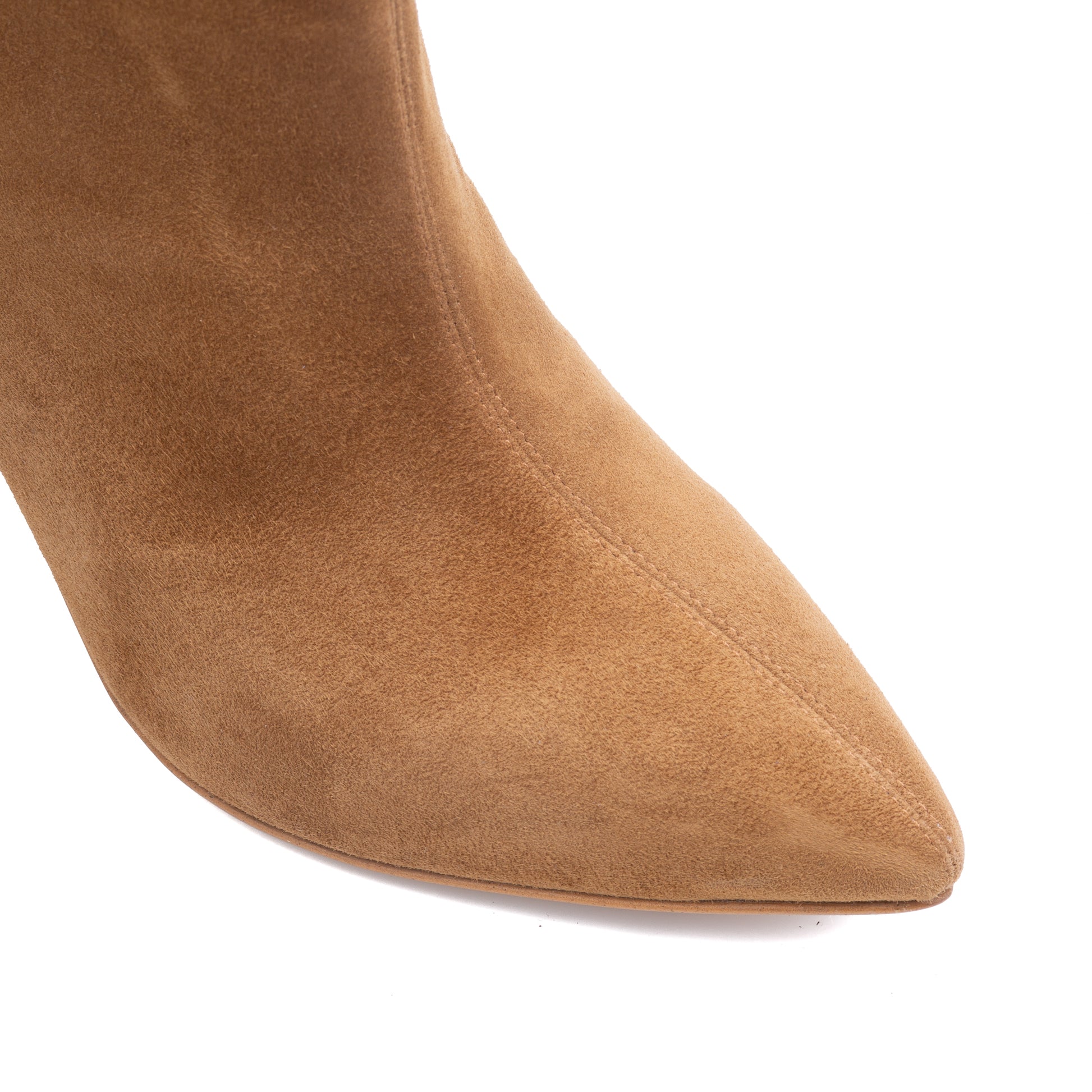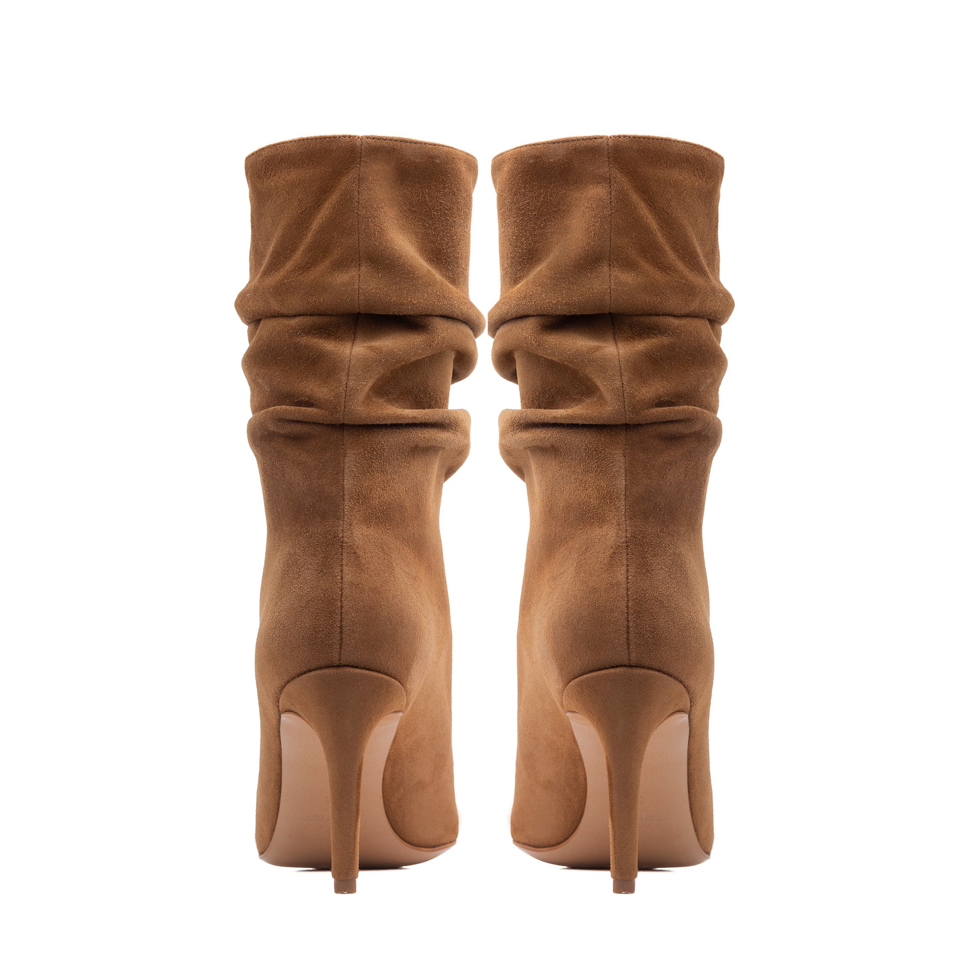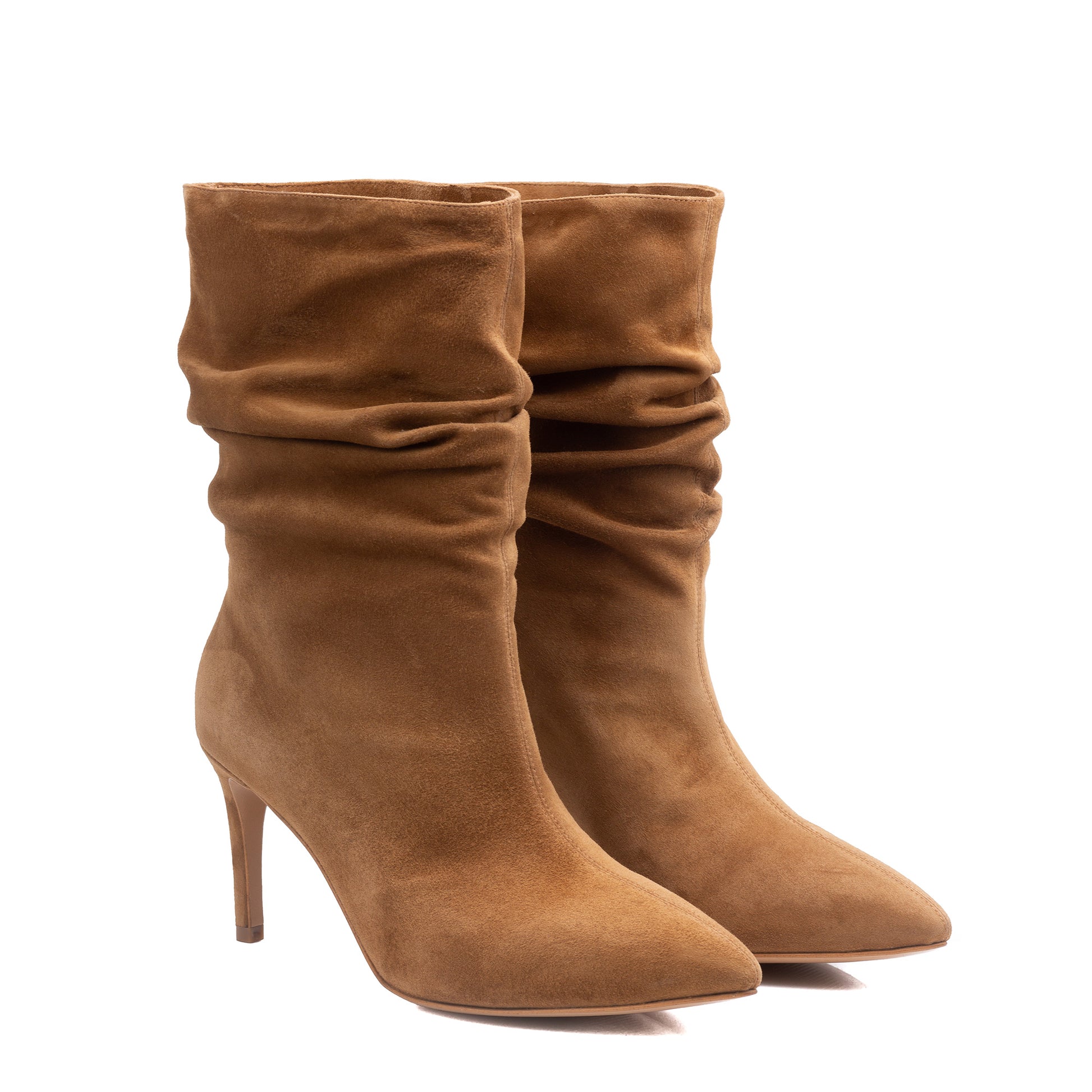 Cizme clasice, fronsate, inalte de cca 20 cm (marimea 38) cu toc subtire, fara fermoar, putin largi pe gamba, potrivite atat peste ciorapi, cat si peste pantaloni.