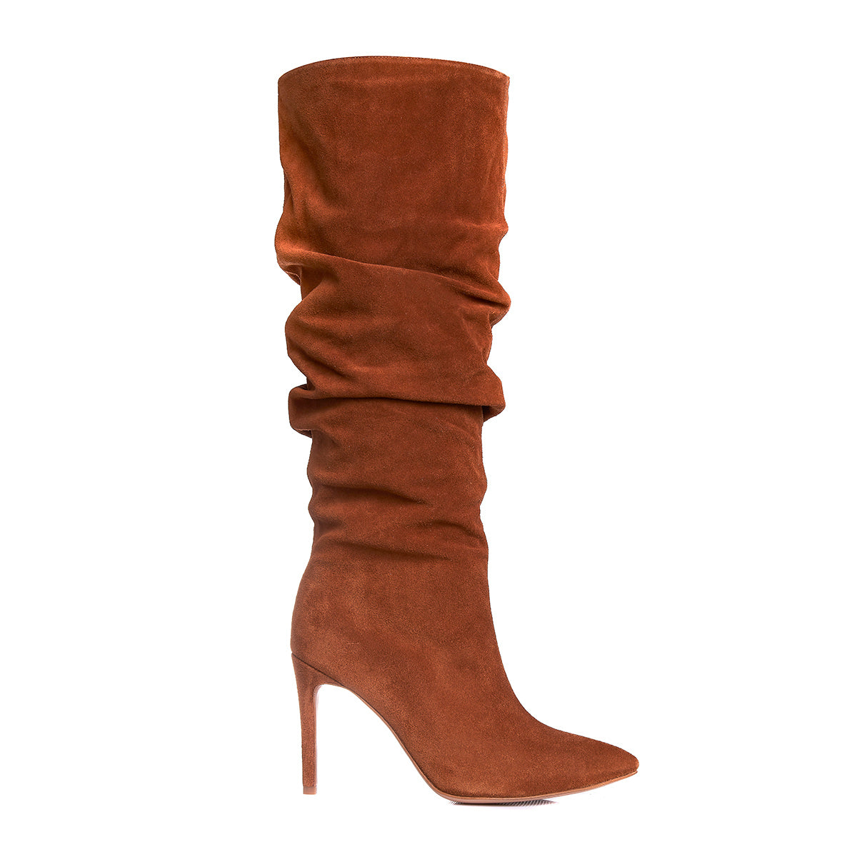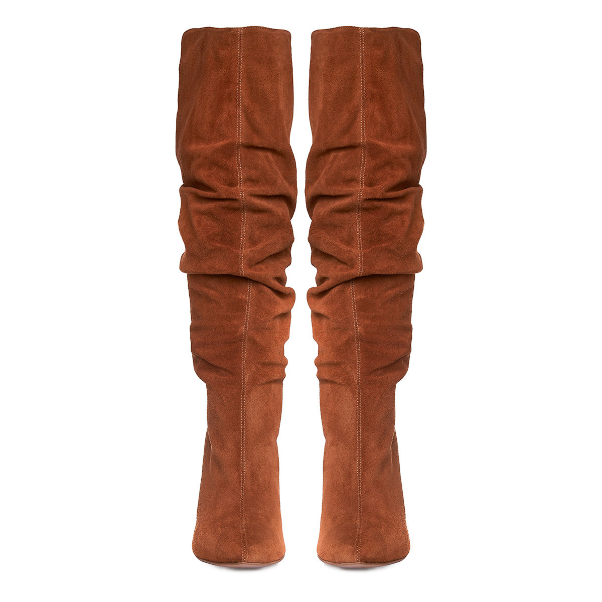 Cizmele clasice fronsate, inalte de cca 40 cm (marimea 38) cu toc subtire, fara fermoar, putin largi pe gamba, le-am reinterpretat in stil urban, fiind realizate din piele intoarsa maron-caramel. Acestea sunt potrivite atat peste ciorapi, cat si peste pantaloni.