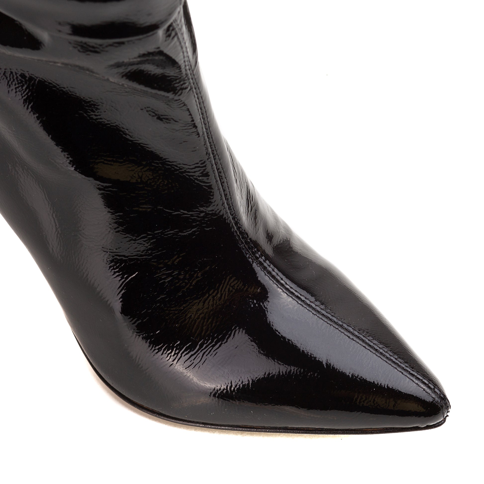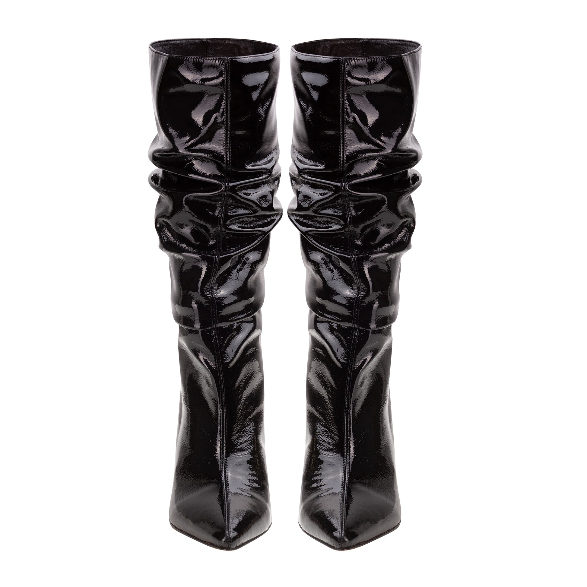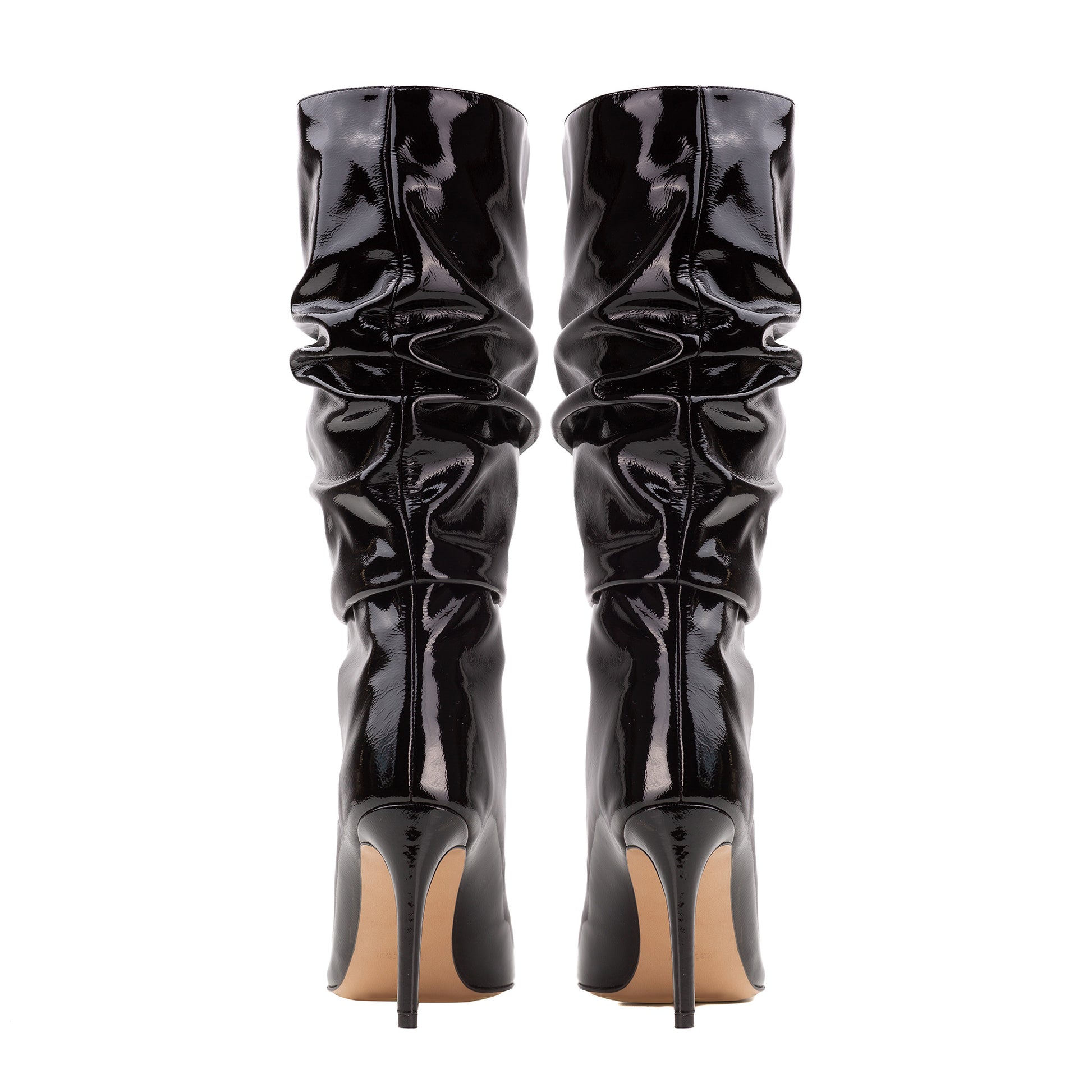Cizmele clasice fronsate, inalte de cca 40 cm (marimea 38) cu toc subtire, fara fermoar, putin largi pe gamba, le-am reinterpretat in stil urman prin folosirea unei piei lacuite de culoare neagra. Acestea sunt potrivite atat peste ciorapi, cat si peste pantaloni.