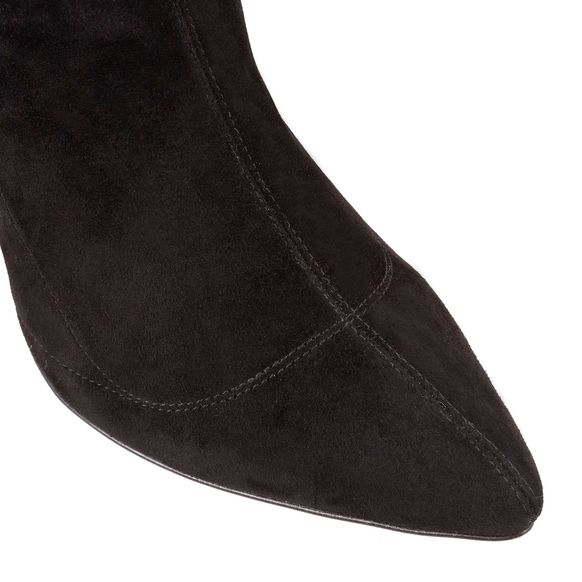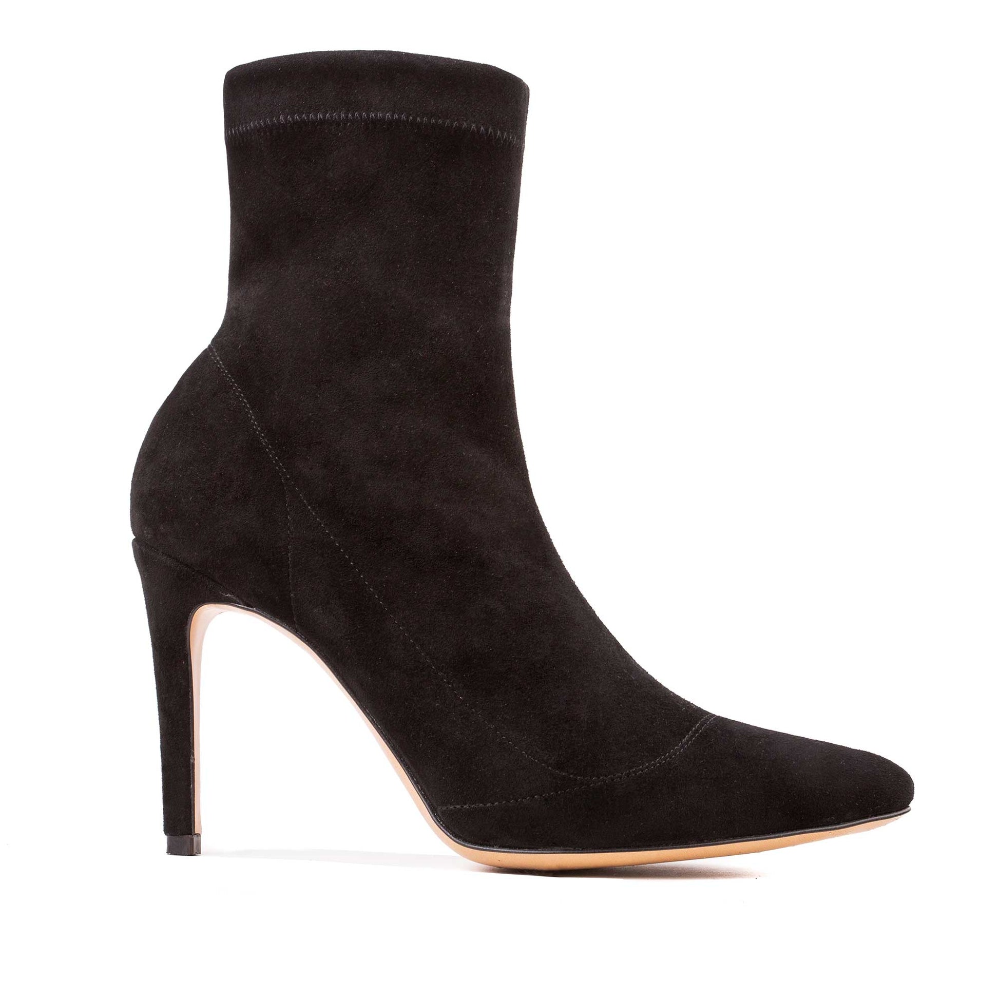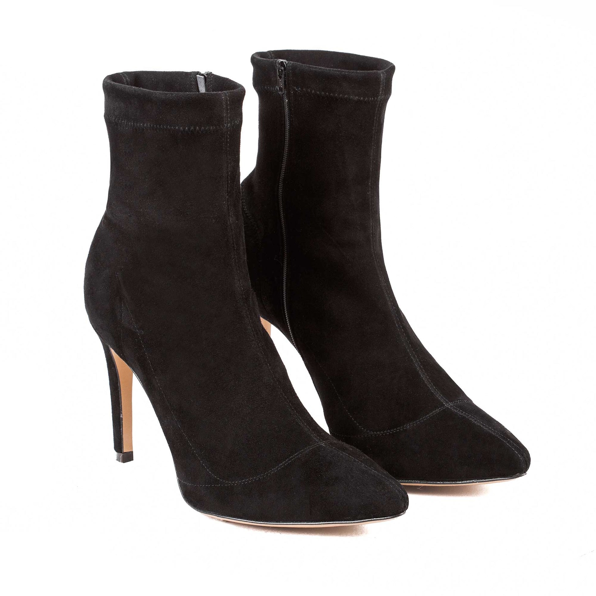 Elegante si rafinate, aceste botine mulate sunt realizate din piele intoarsa elastica neagra. Cu varf ascutit, construite pe un calapod comod, acest model a fost conceput pentru a fi purtat cu ușurință intreaga zi gratie tocului si calapodului lor comod, conferind un aspect de glezna subtire piciorului dvs.