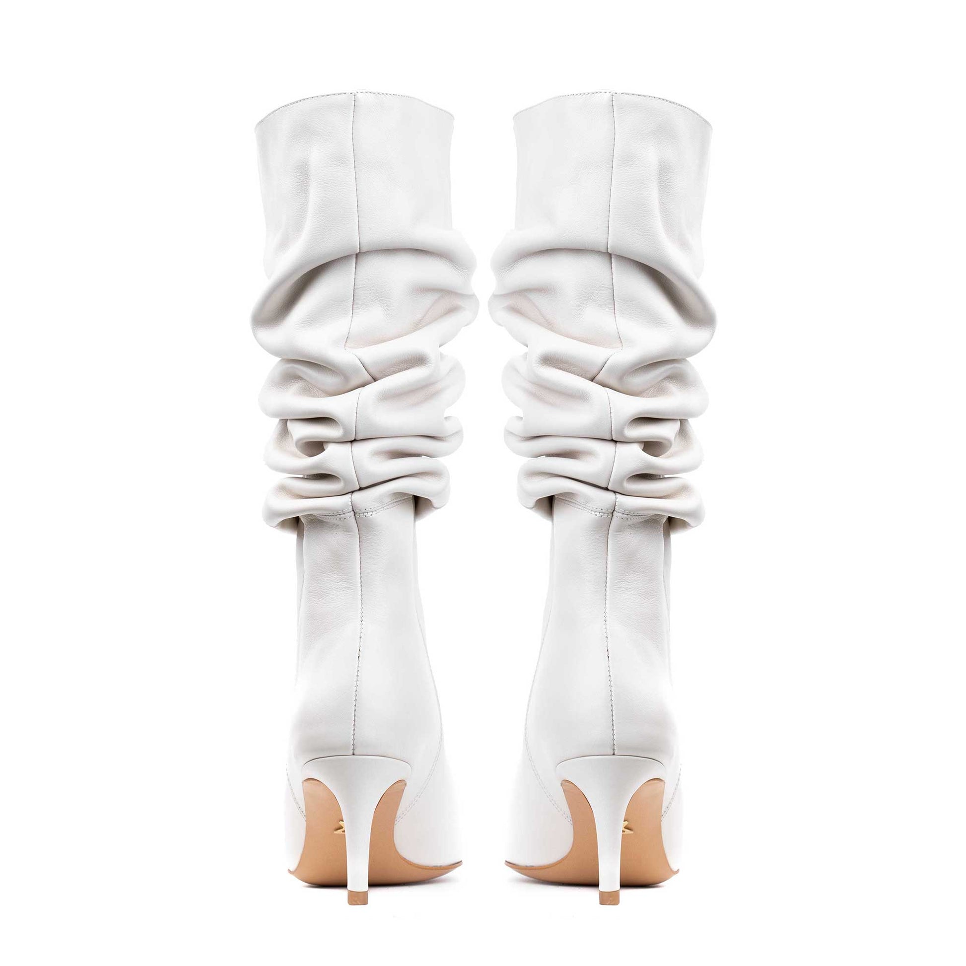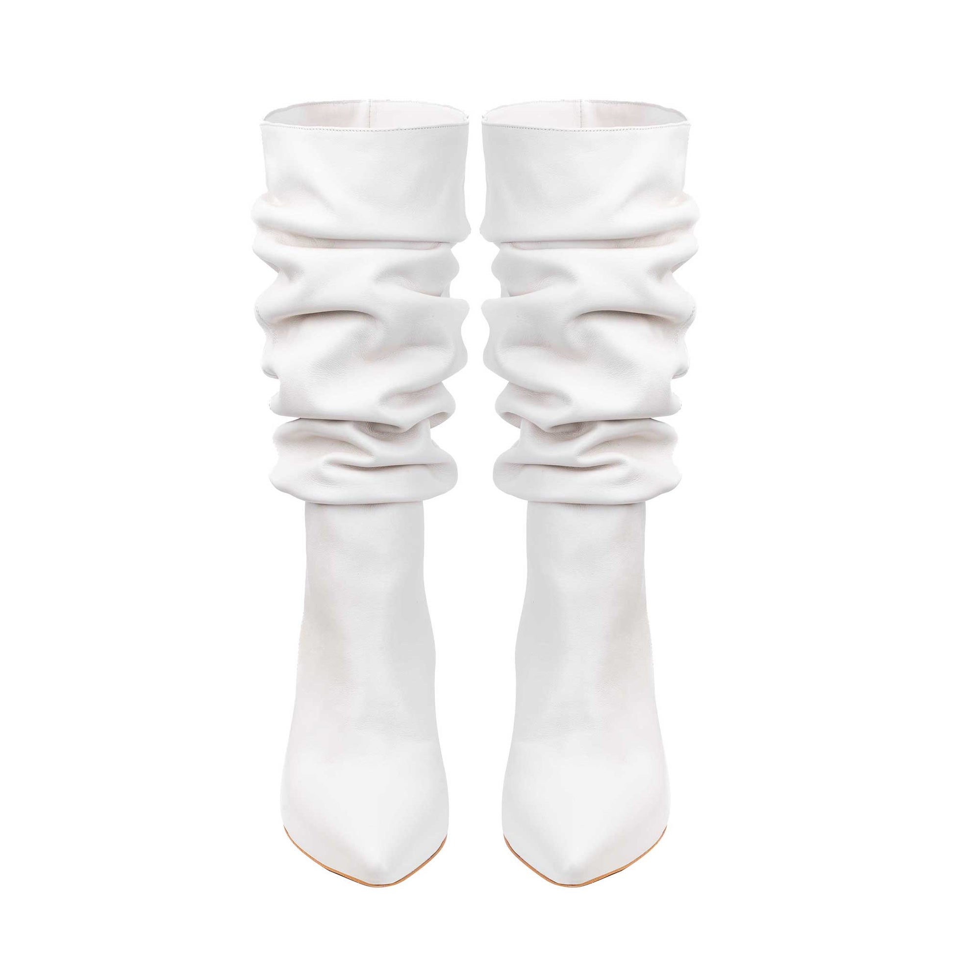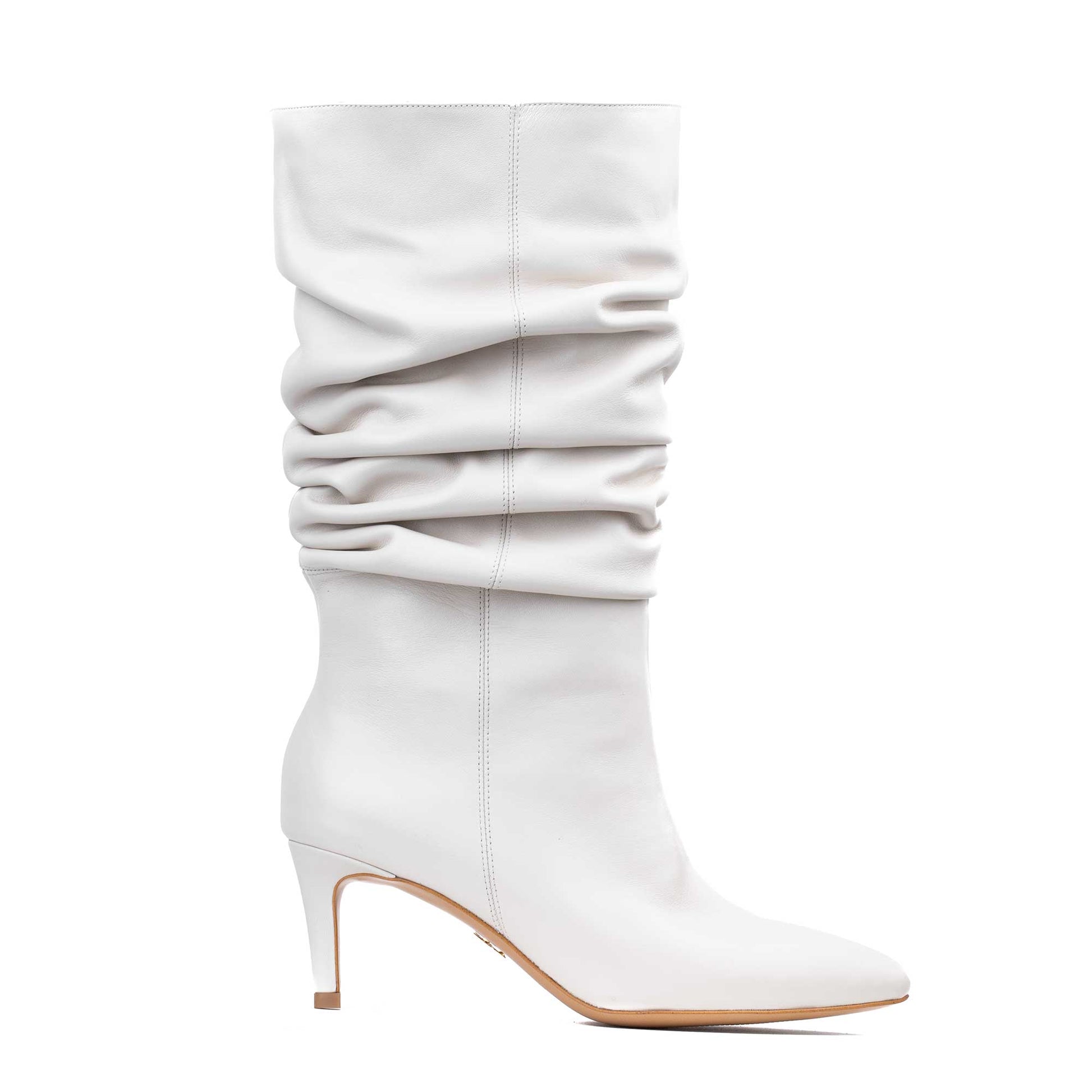 Cizme clasice din piele alb unt, fronsate, inalte de cca 30 cm (marimea 38) cu toc subtire, fara fermoar, putin largi pe gamba, potrivite atat peste ciorapi, cat si peste pantaloni.