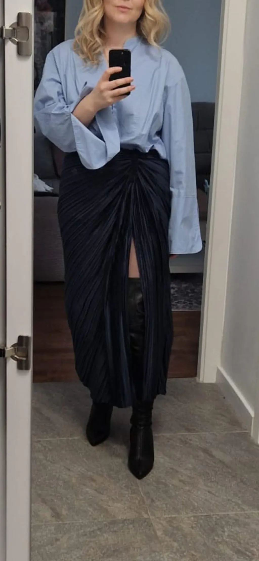 Cizme Mia din Piele Elastica, Peste Genunchi, Negre