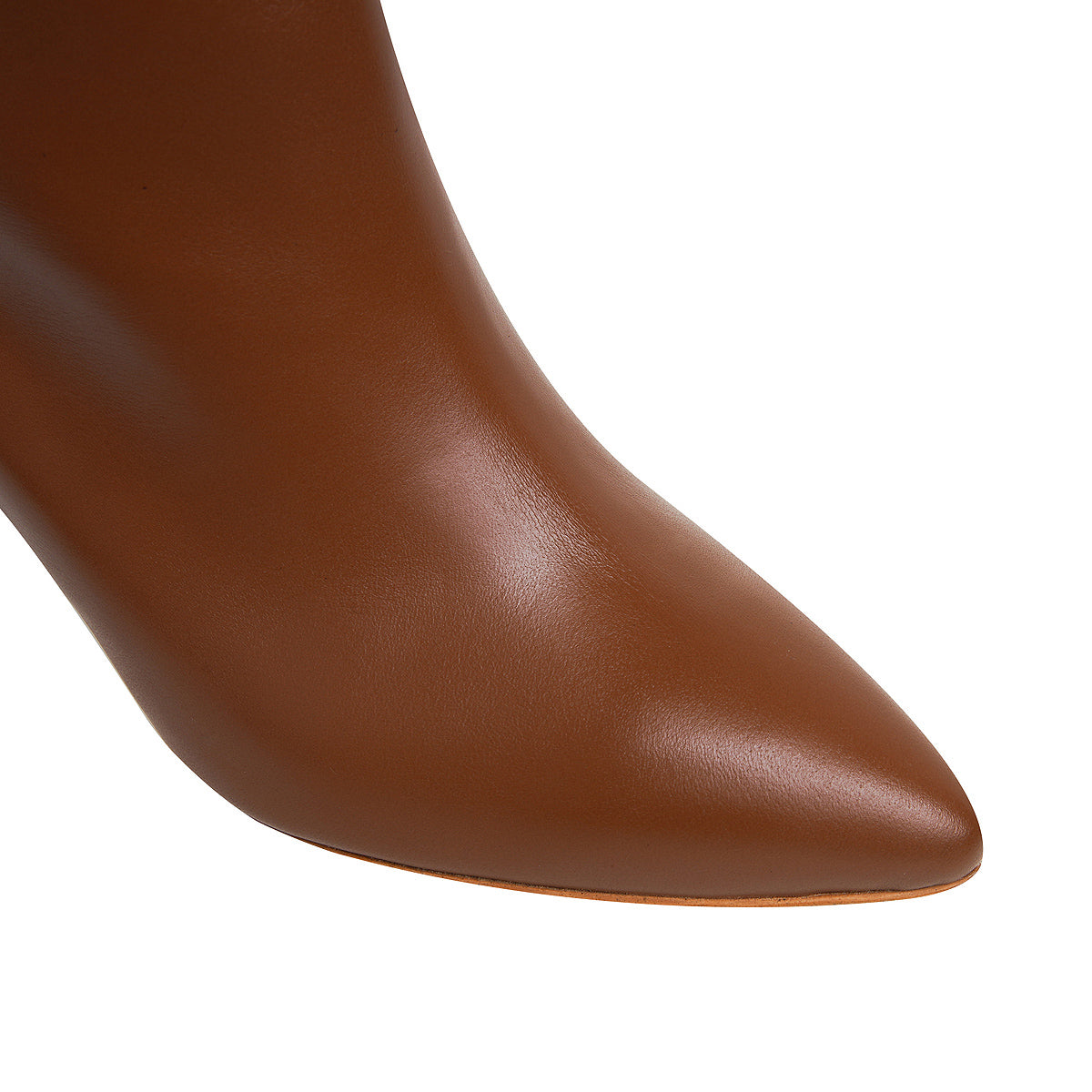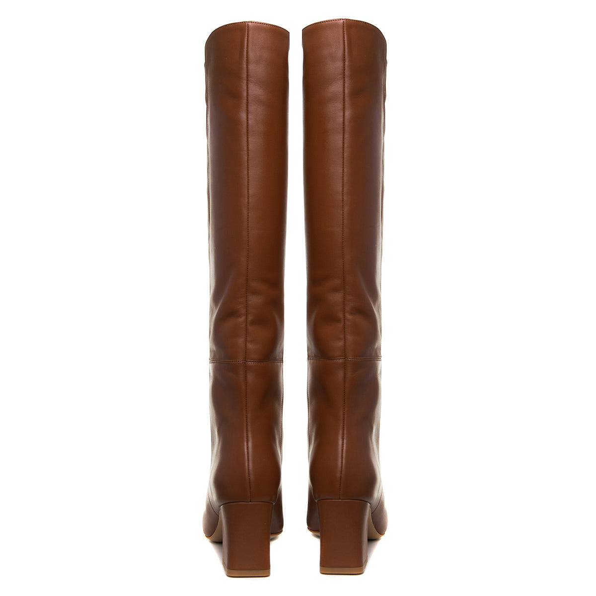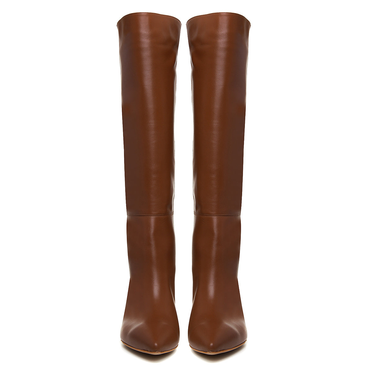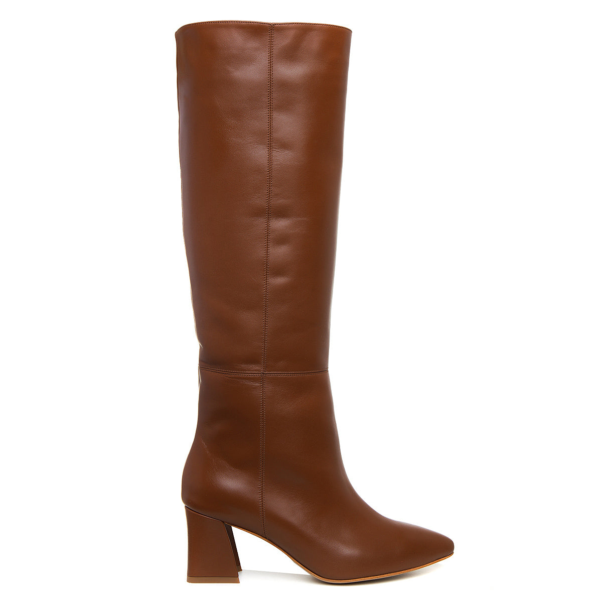 Elegante si rafinate, aceste cizme clasice, largi pe picior, fara fermoar, flateaza aproape orice tip de silueta. Cu varf ascutit, calapod comod si toc gros, acest model a fost conceput din piele naturala maron-caramel pentru a fi purtat cu ușurință atat la tinute de zi, cat si de seara.