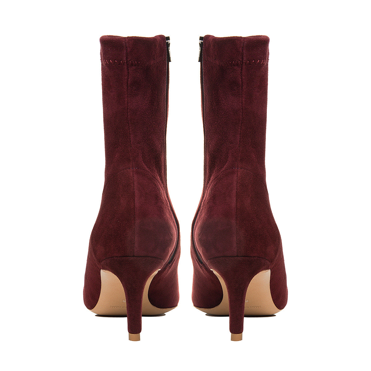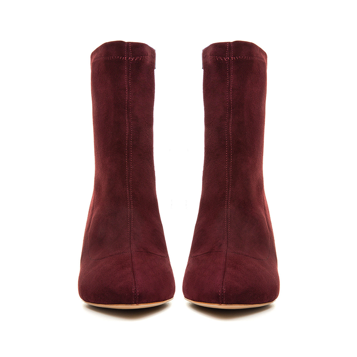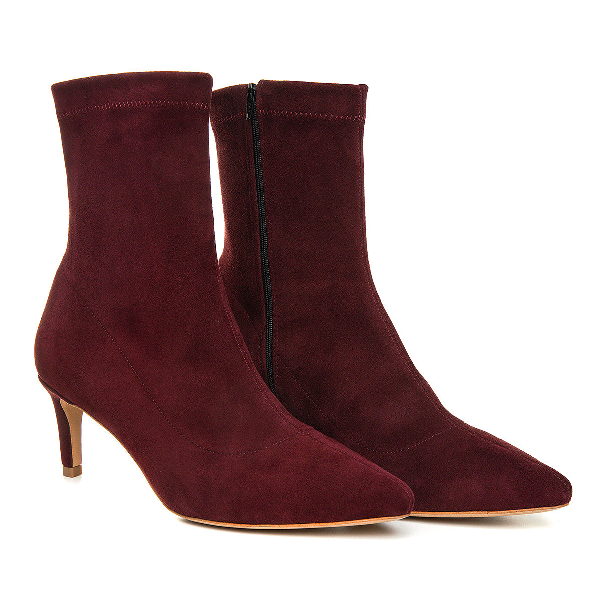 Elegante si rafinate, aceste botine mulate sunt realizate din piele intoarsa elastica burgundy. Cu varf ascutit, construite pe un calapod comod, acest model a fost conceput pentru a fi purtat cu ușurință intreaga zi gratie tocului si calapodului lor comod, conferind un aspect de glezna subtire piciorului dvs.