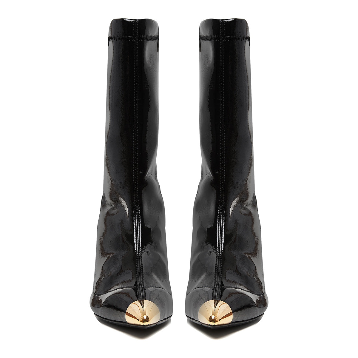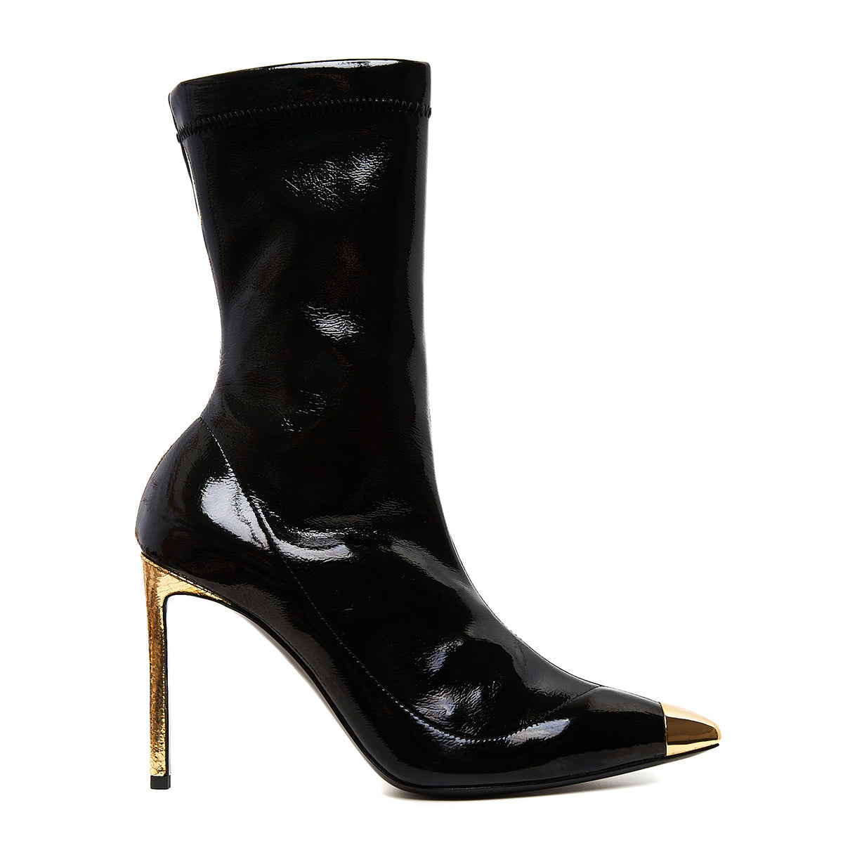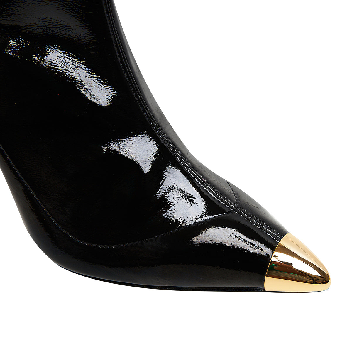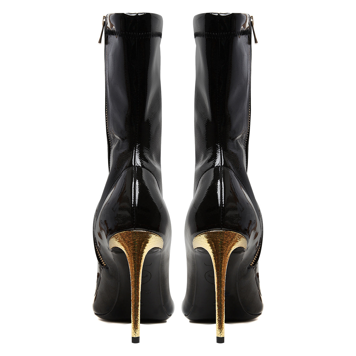 Ghetutele PUNK din piele ecologica elastica cu tocul imbracat in piele naturala aurie si varf metalic sunt o alegere indrazneata pentru a completa orice tinuta sexy.