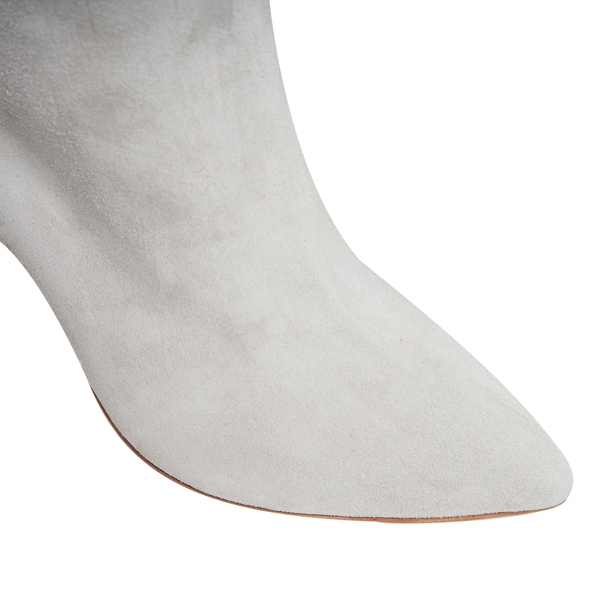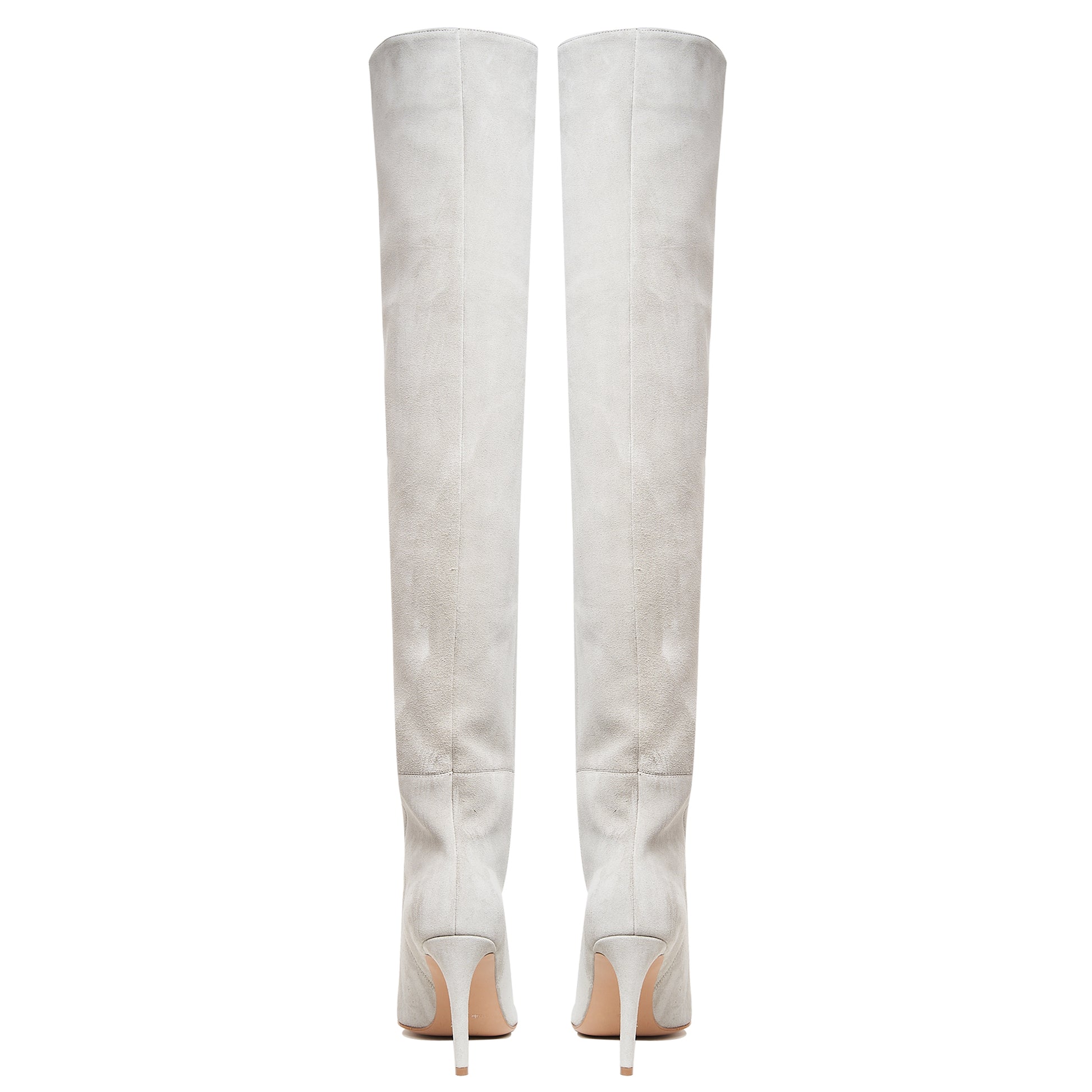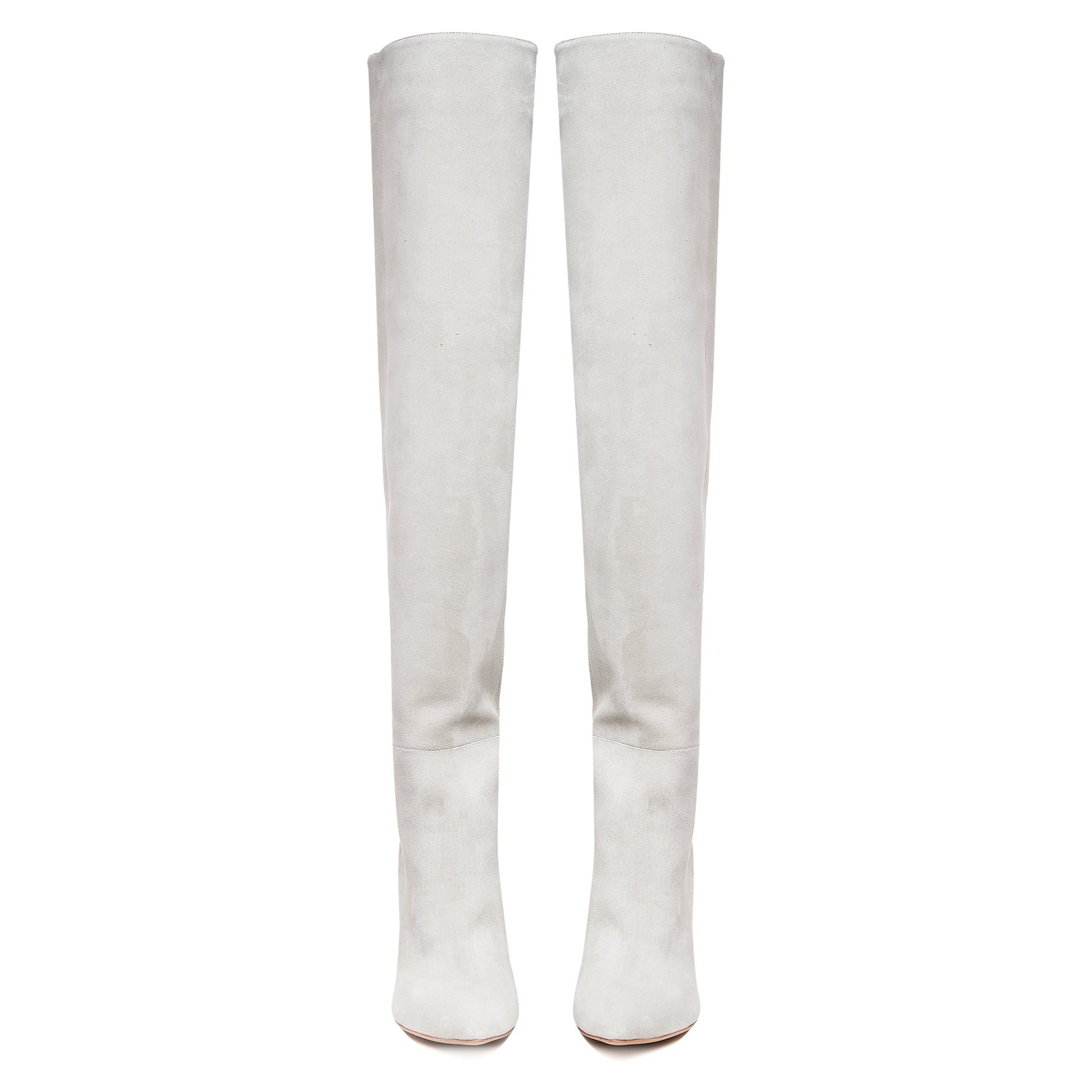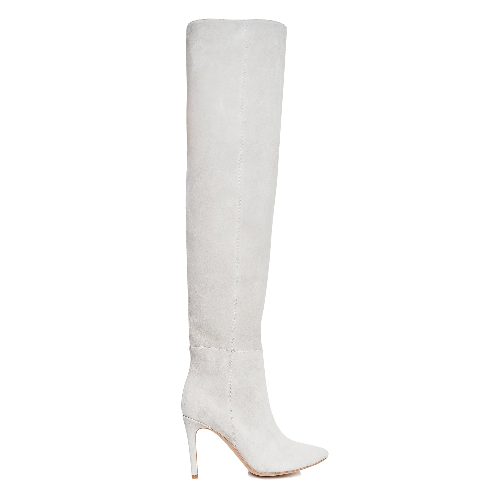 Elegante si rafinate, aceste cizme clasice, largi pe picior, fara fermoar, flateaza aproape orice tip de silueta. Cu o lungime de aproximativ 60 cm , din calcai pana peste genunchi , cu varf ascutit si calapod comod, acest model este realizat din piele intoarsa gri deschis.