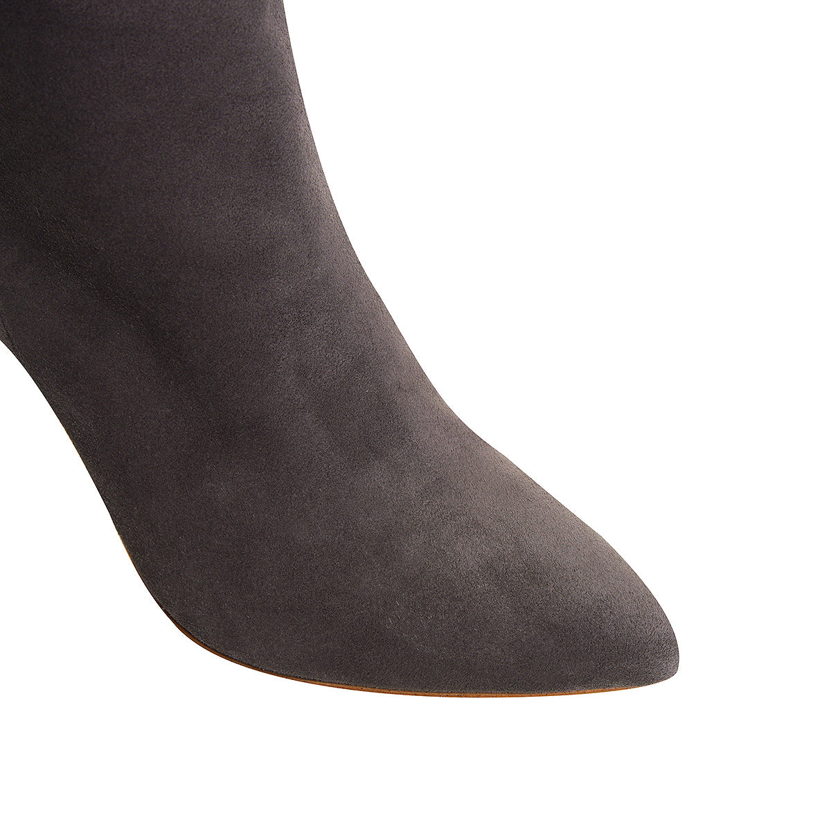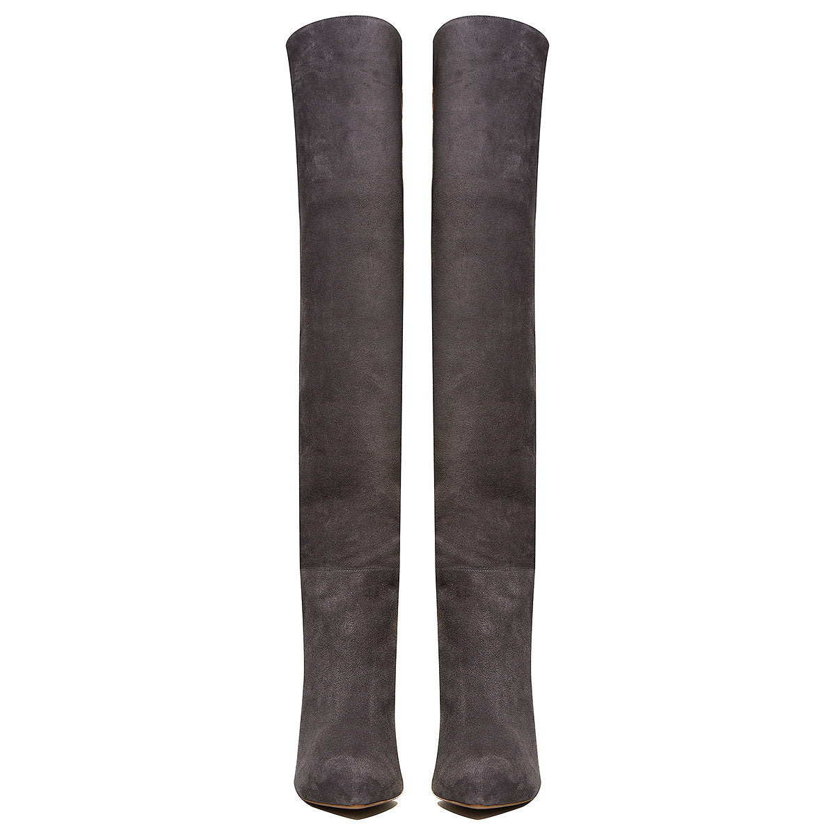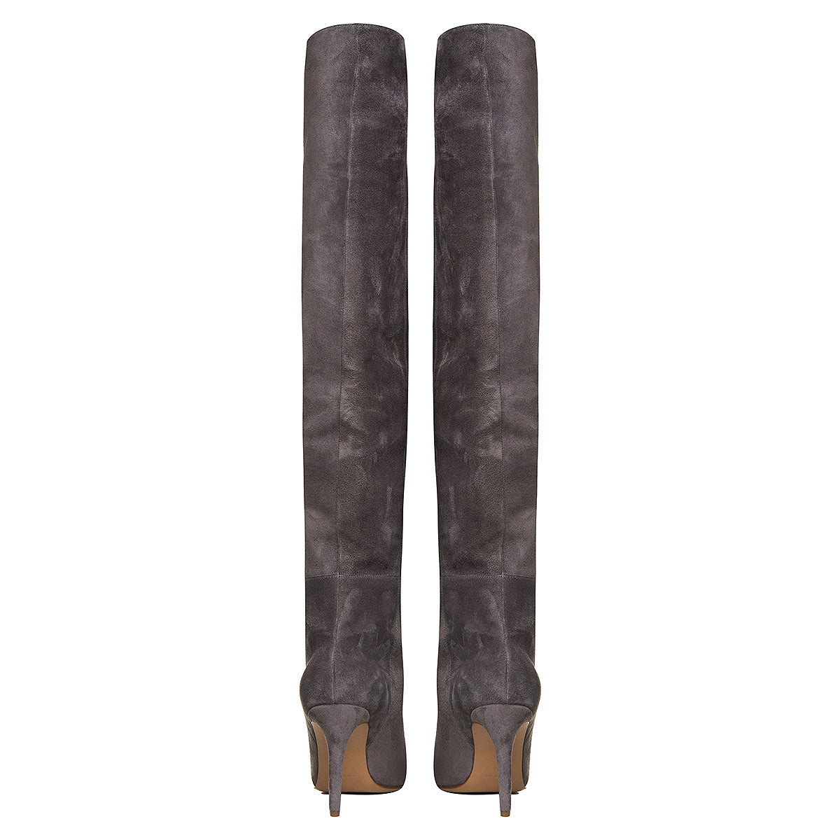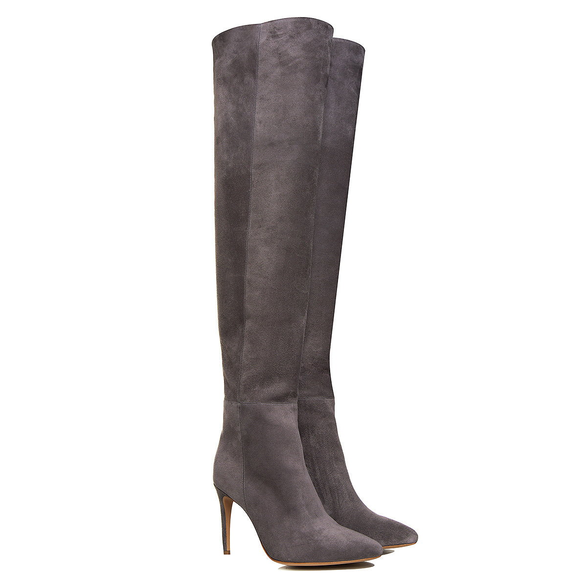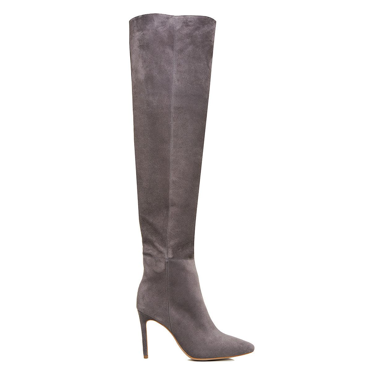 Elegante si rafinate, aceste cizme clasice, largi pe picior, fara fermoar, flateaza aproape orice tip de silueta. Cu o lungime de aproximativ 60 cm , de la calcai pana peste genunchi , cu varf ascutit si calapod comod, acest model este realizat din piele intoarsa gri, putand fi purtat cu usurinta intreaga zi sau seara.