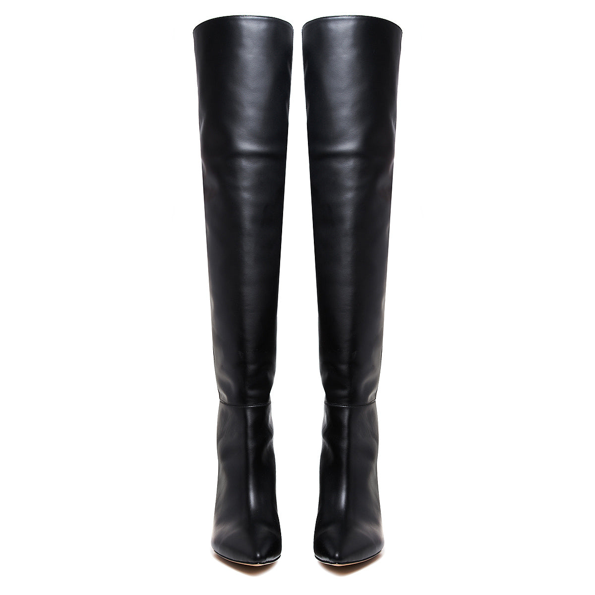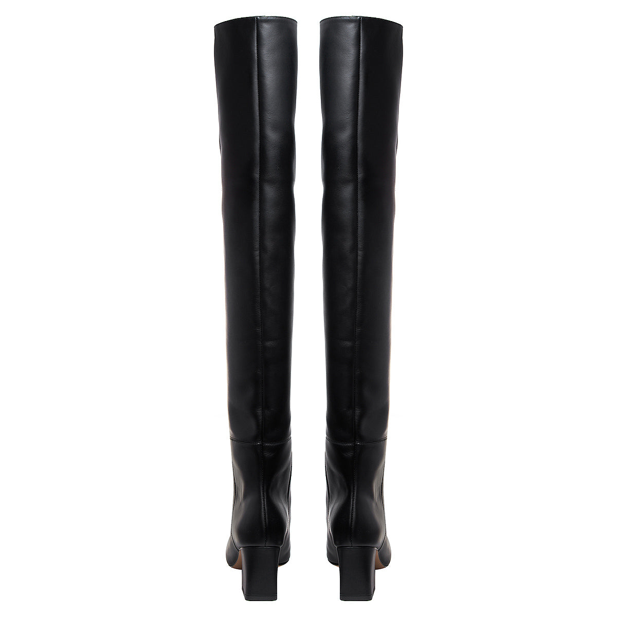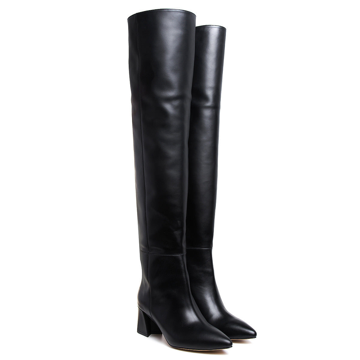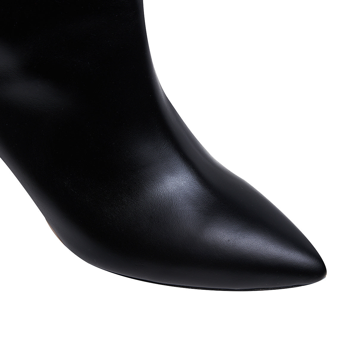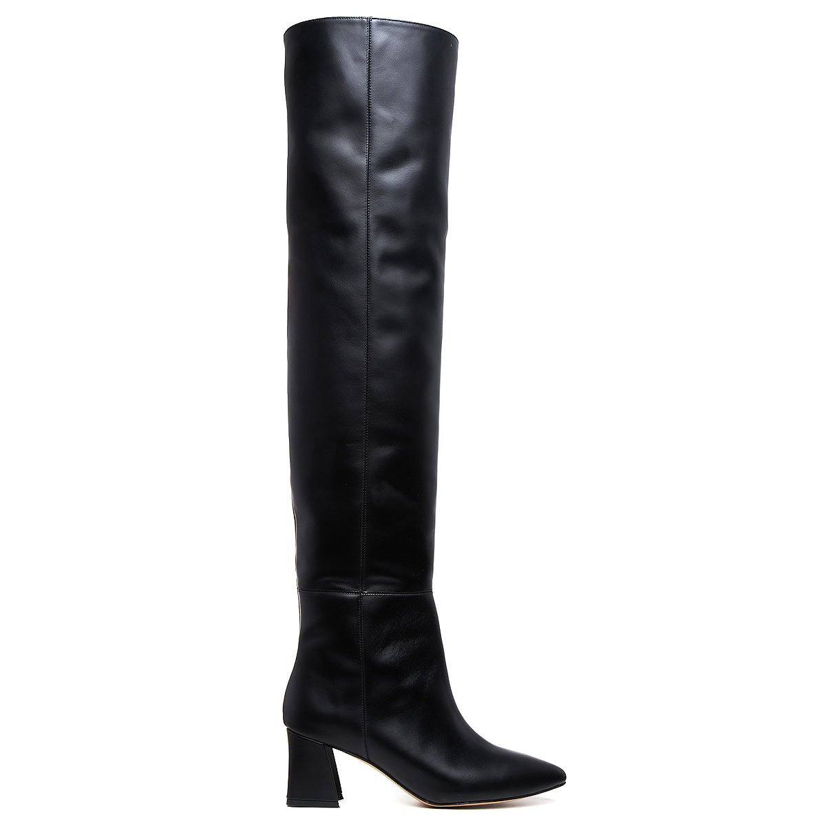 Elegante si rafinate, aceste cizme clasice, largi pe picior, fara fermoar, peste genunchi, de cca 60 cm de la calcai, flateaza aproape orice tip de silueta. Cu varf ascutit si calapod comod si toc gros, acest model din piele neagra a fost conceput pentru a fi purtat cu usurinta intraga zi sau seara.