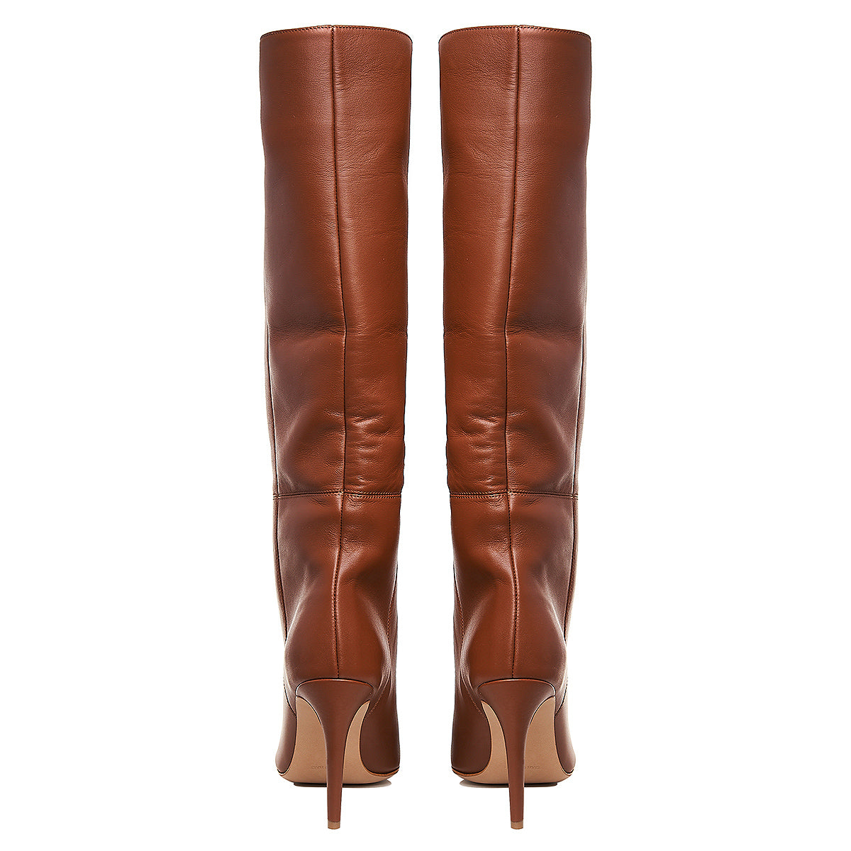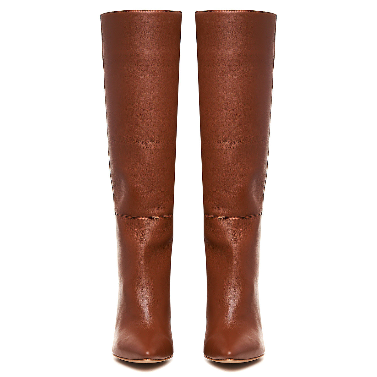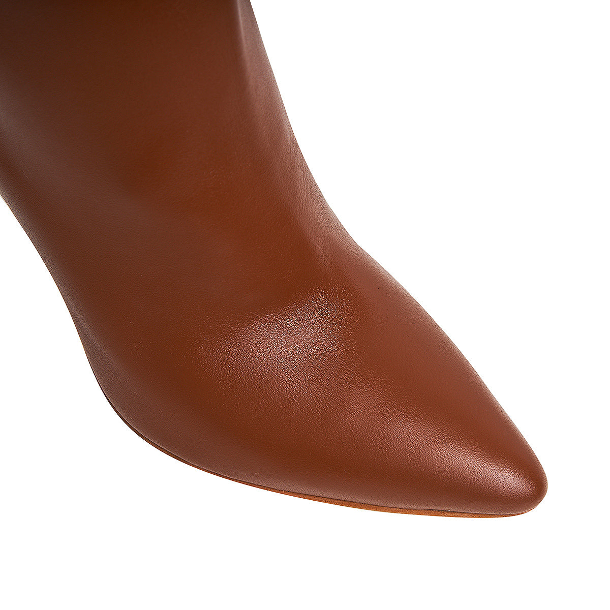Elegante si rafinate, aceste cizme clasice, largi pe picior, fara fermoar, flateaza aproape orice tip de silueta. Cu varf ascutit si calapod comod, acest model a fost conceput din piele naturala maron-caramel pentru a fi purtat cu ușurință atat la tinute de zi, cat si de seara.
