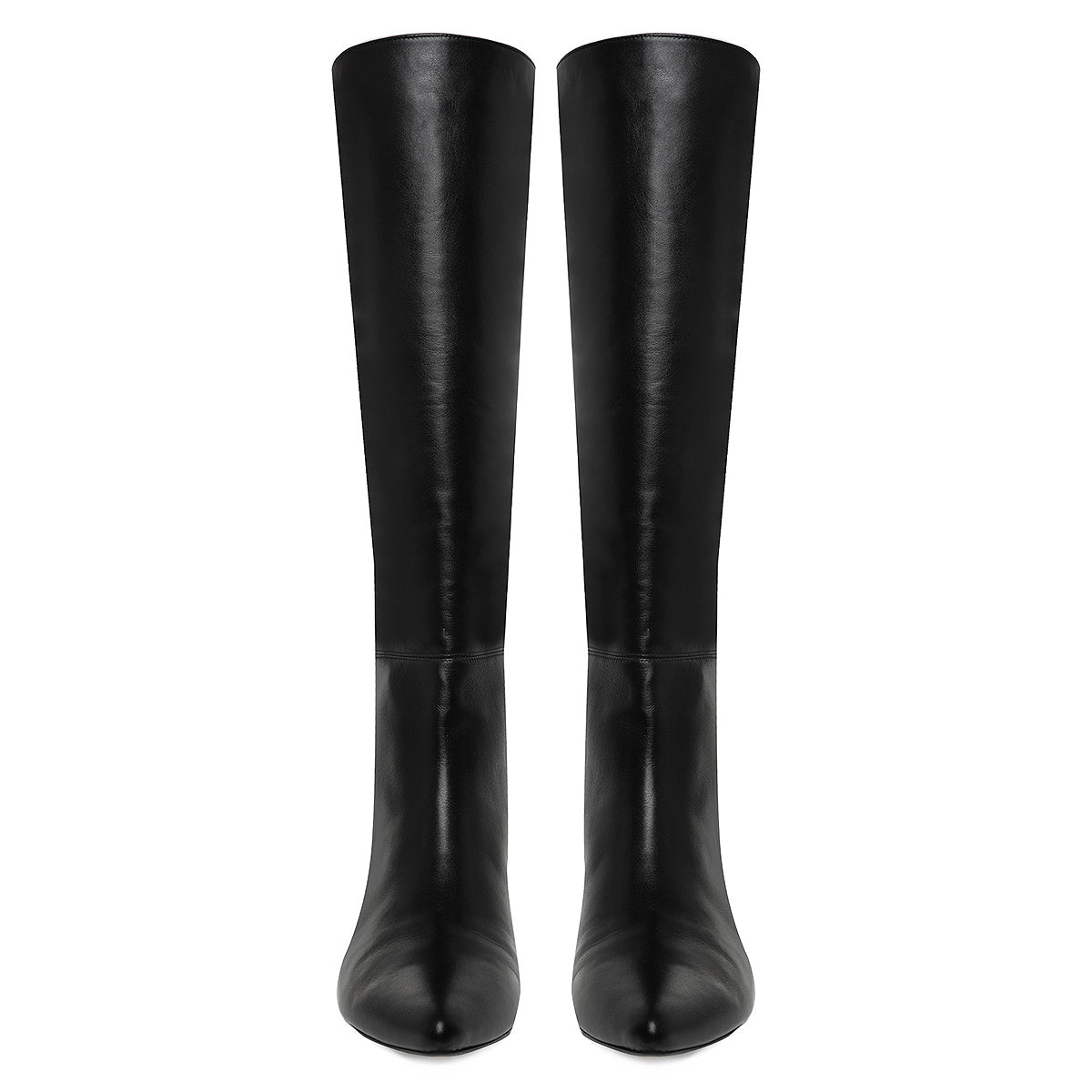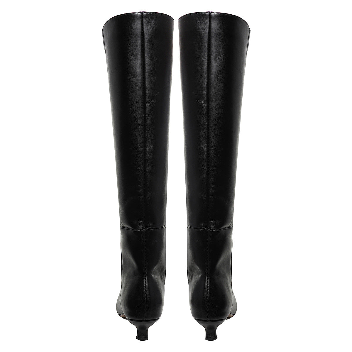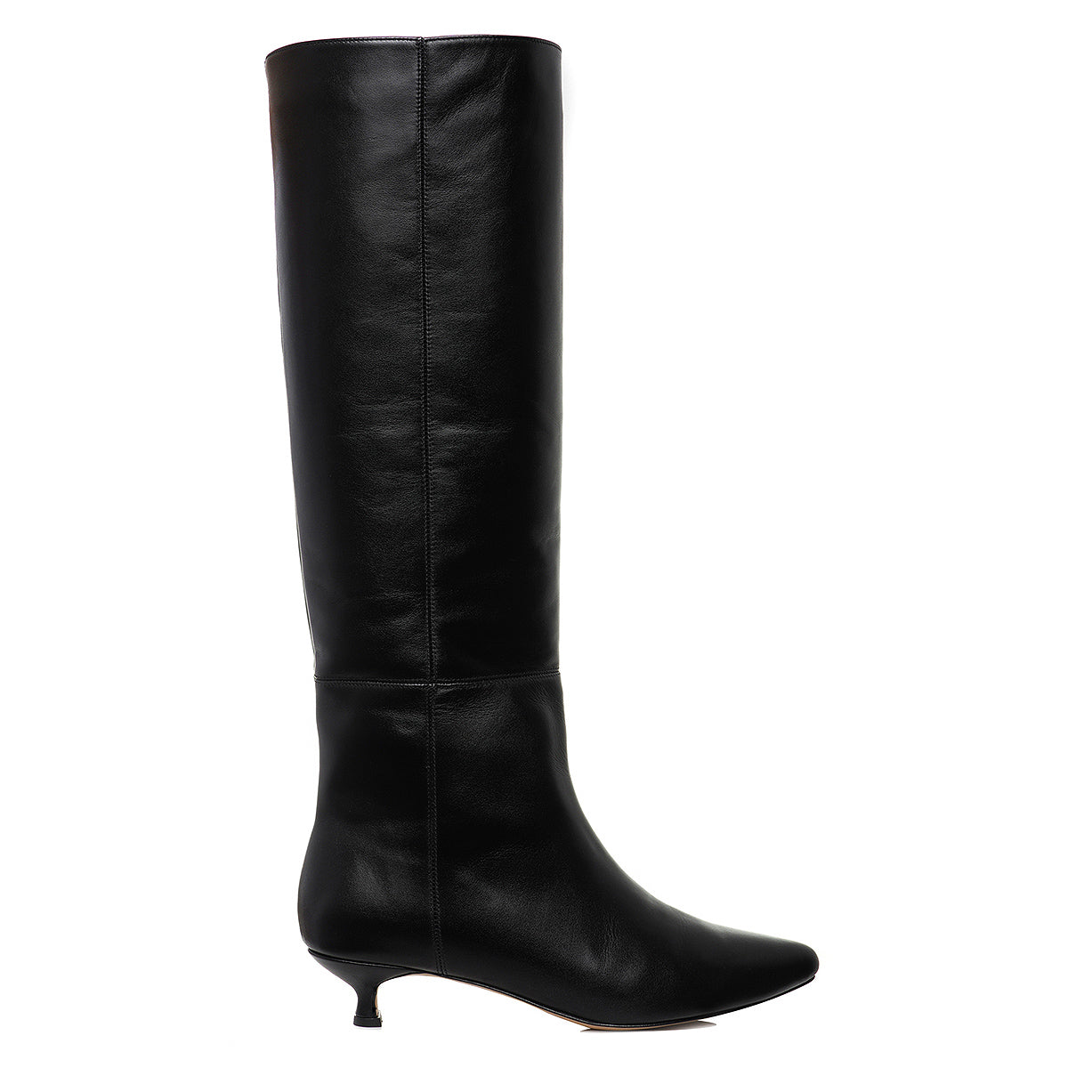 Elegante si rafinate, aceste cizme clasice, largi pe picior, fara fermoar, flateaza aproape orice tip de silueta. Cu varf ascutit si realizate pe un calapod nou cu toc kitten, acest model a fost conceput din piele naturala neagra pentru a fi purtat cu usurinta atat la tinute de zi, cat si de seara.