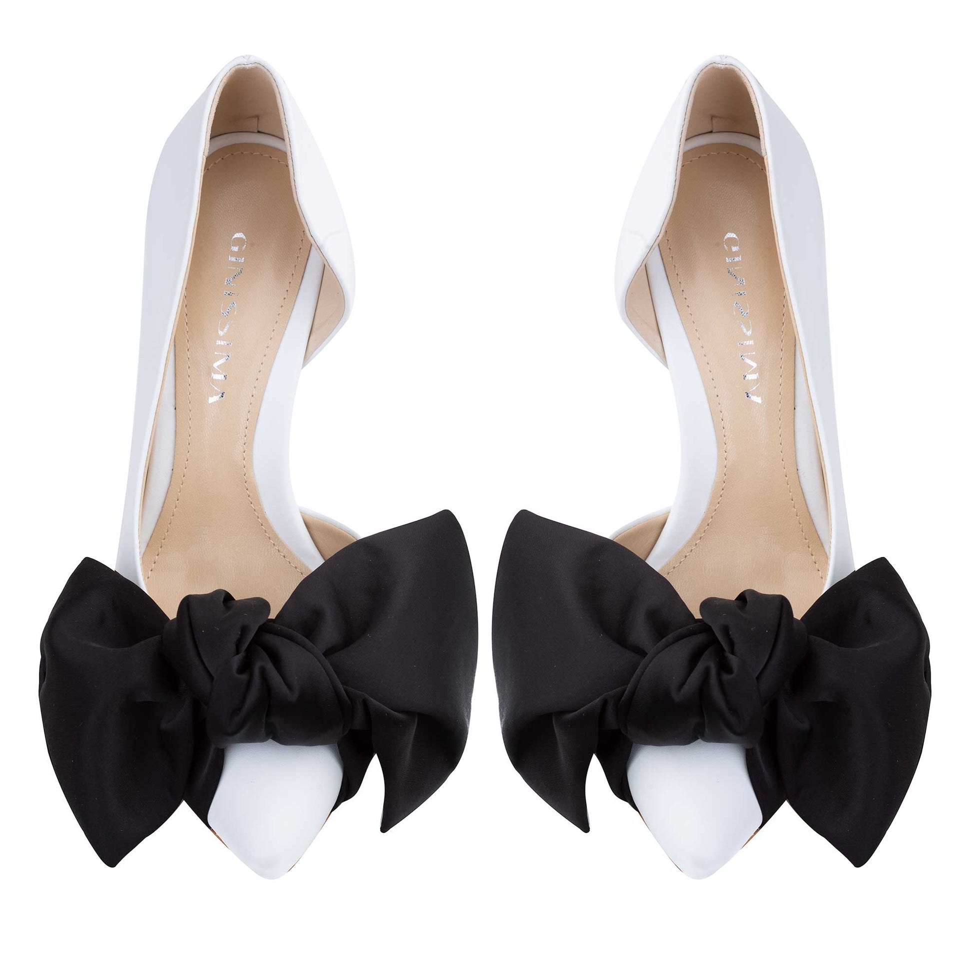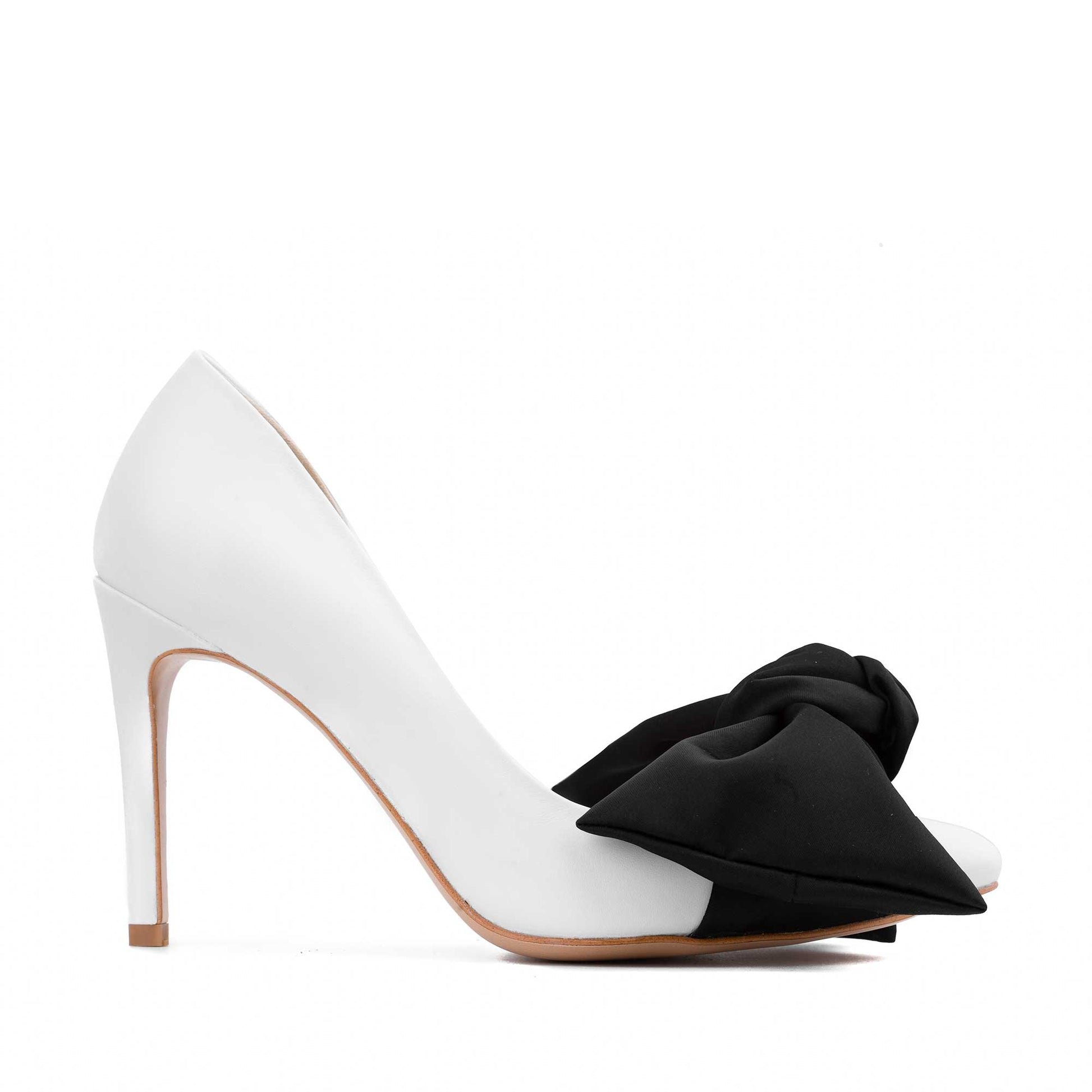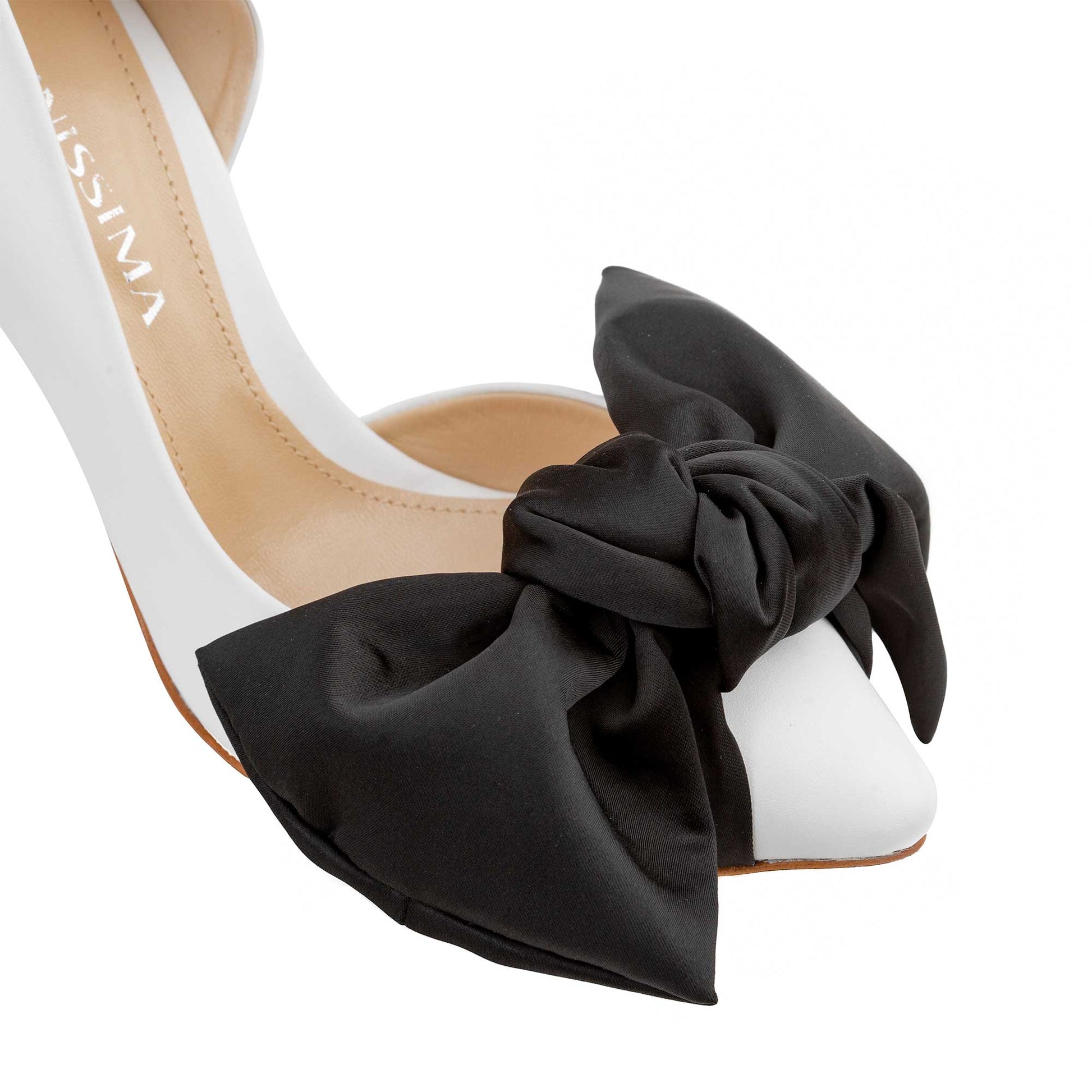 Acest model ilustreaza perfectiunea unui pantof de tip stiletto clasic, fiind realizat de noi din piele alba, interior nude, iar decupajul si funda supradimensionata din satin negru ii aduc un plus de sofisticare.