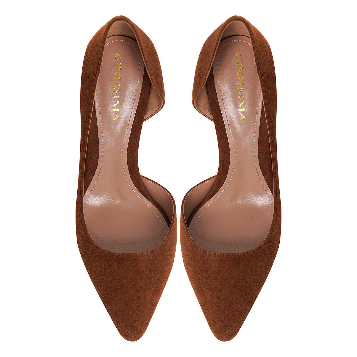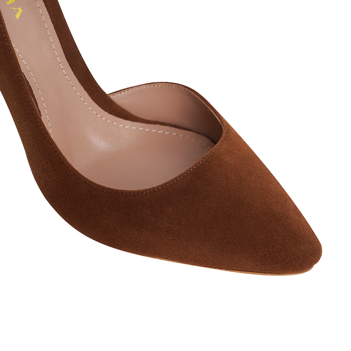 Pantofii Samantha ilustreaza delicatetea unui pantof de tip stiletto clasic, reinterpretat in tendinte actuale prin decupajul lateral. Acestia sunt realizati din piele intoarsa maro-ciocolatiu si interior din piele naturala nude.