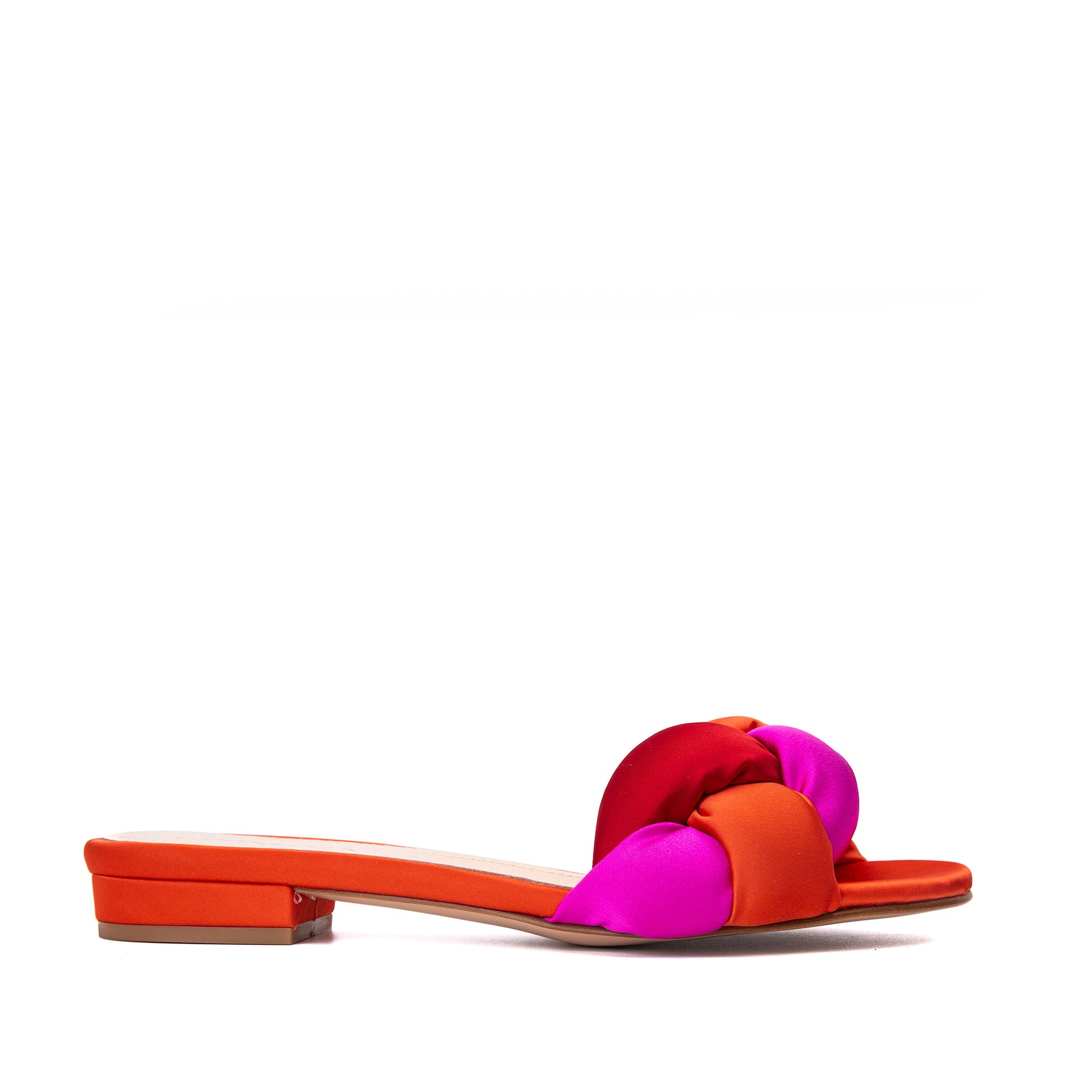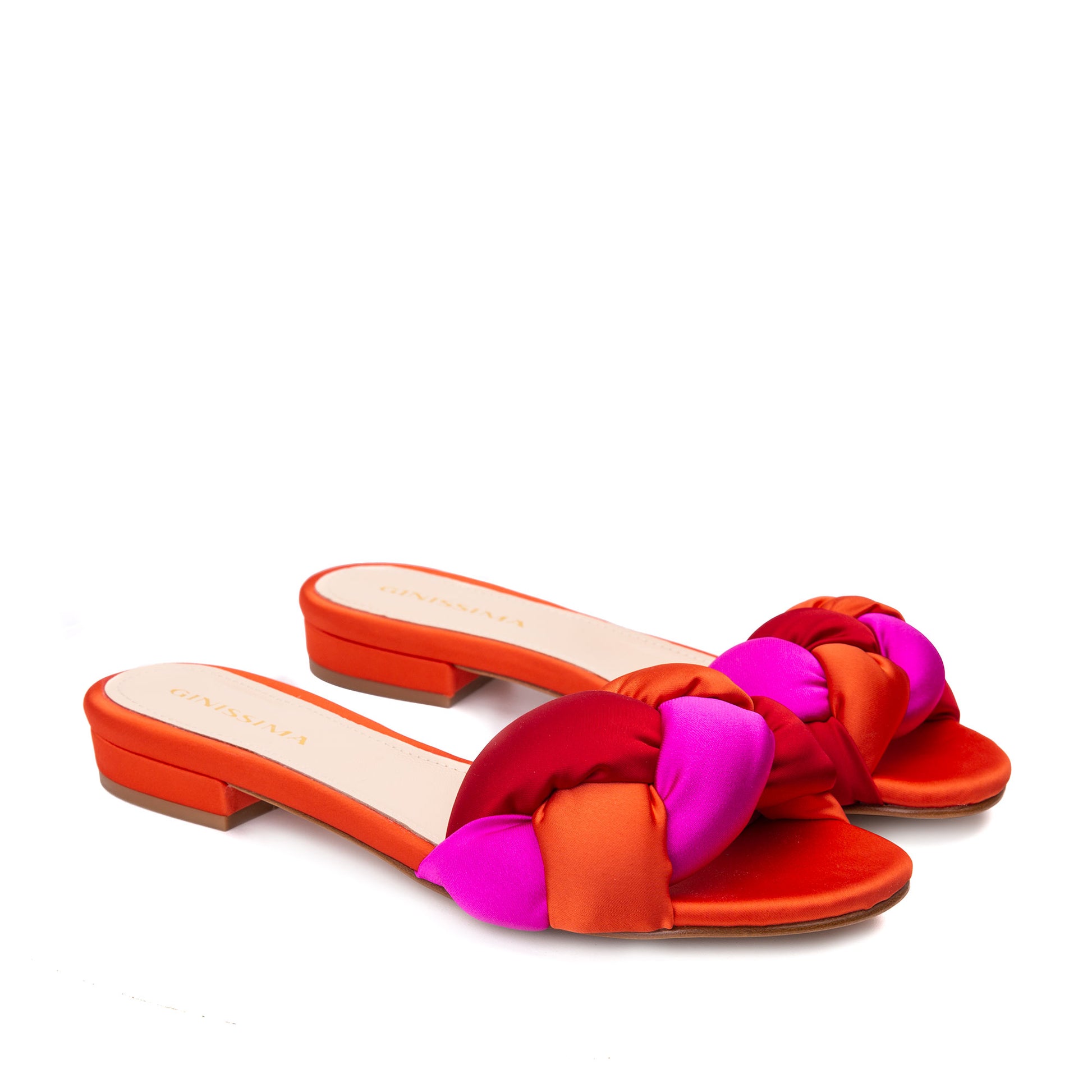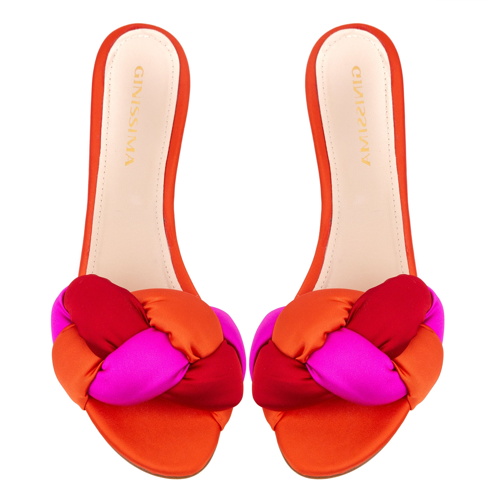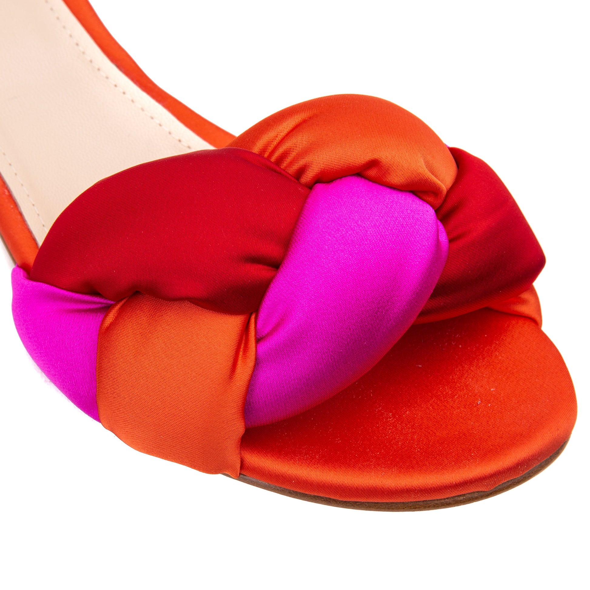 Tocul modelului din poza este de 1 cm si imbracat in materialul papucului, satin multicolor in nuante de orange, fucsia si rosu.