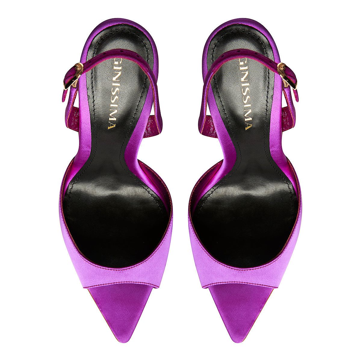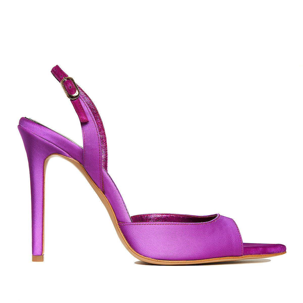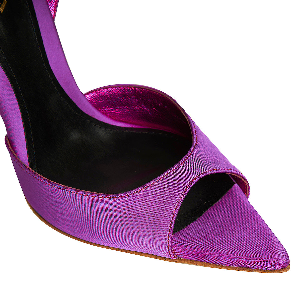 Sandalele Vicky cu varf ascutit completeaza perfect o tinuta de zi sau de seara, fiind realizate din satin mov la exterior si interior din piele naturala neagra, pe un toc subtire, iar bareta reglabila de la spate garanteaza o tinuta perfecta si comoda.