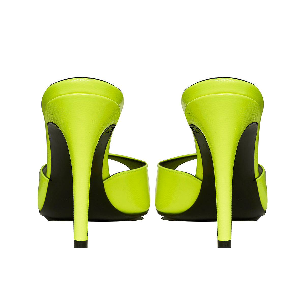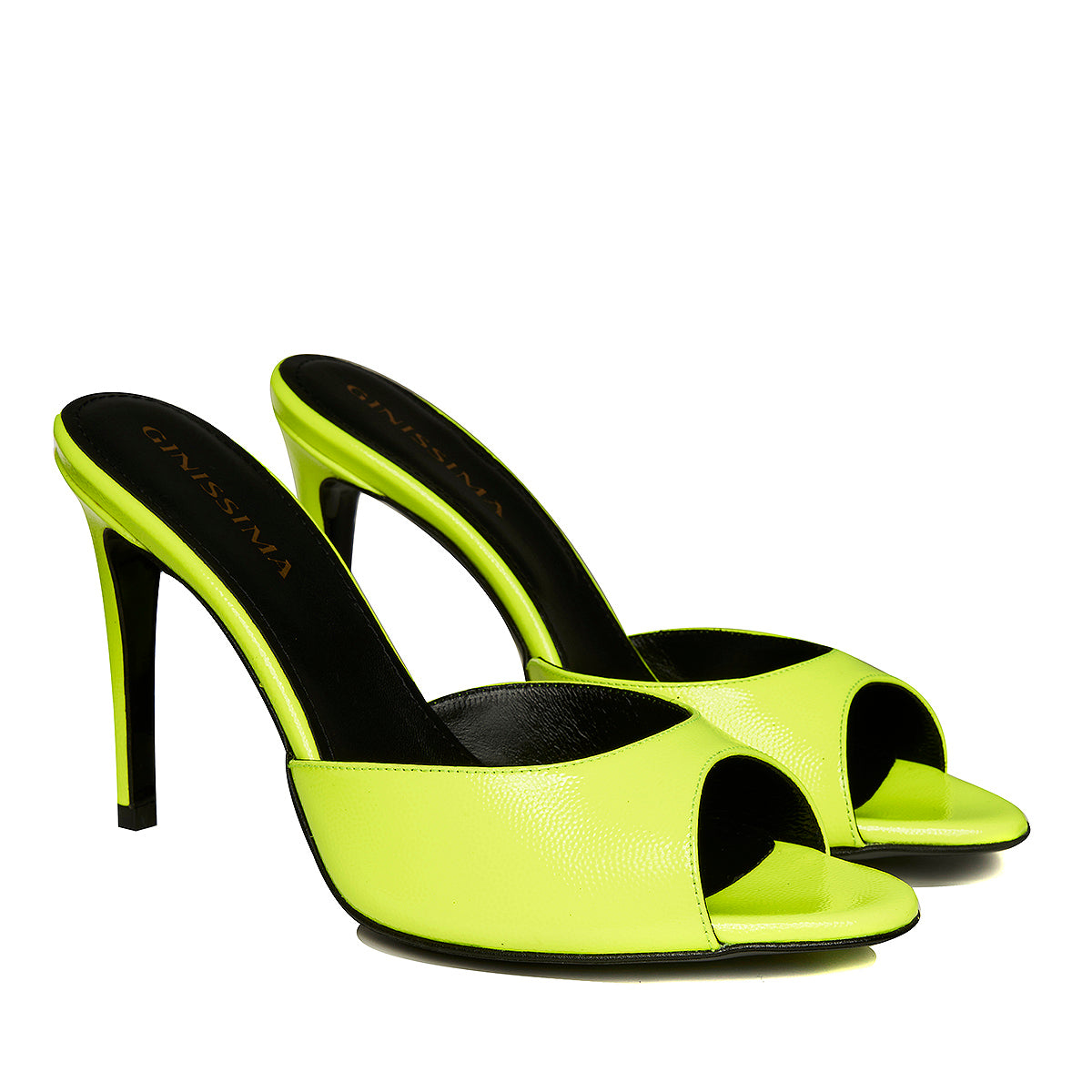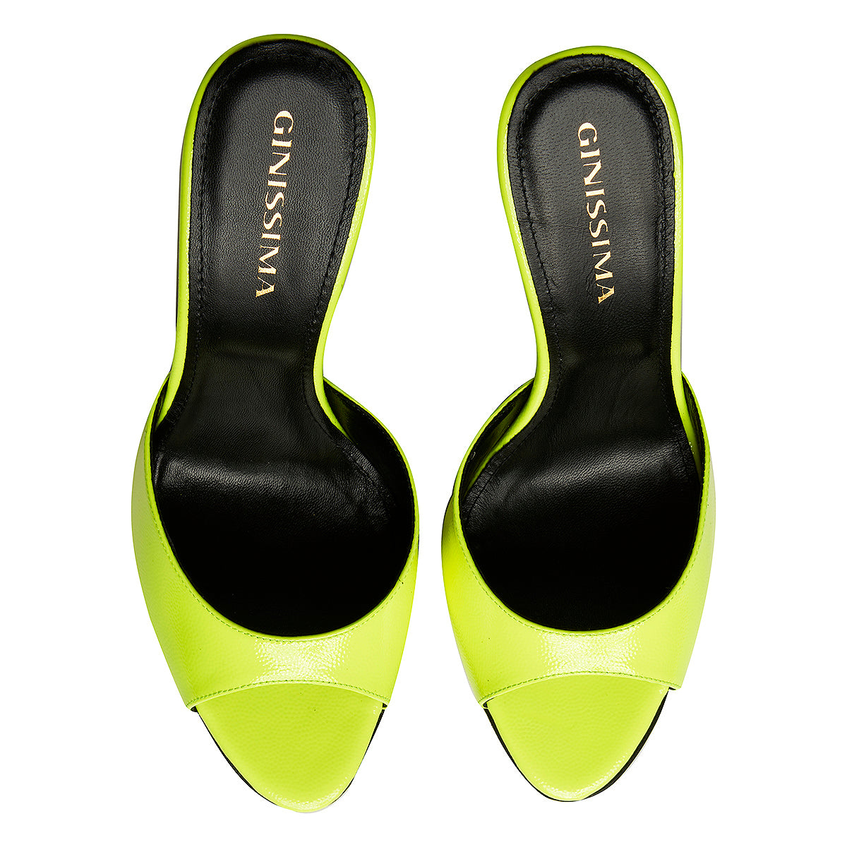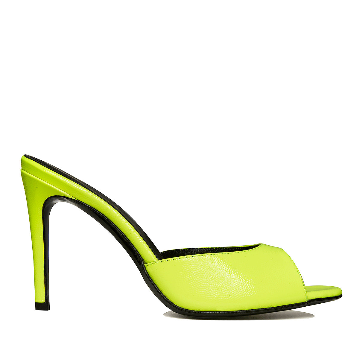 Sabotii Vicky completeaza perfect o tinuta de zi sau de seara, casual sau eleganta. Sunt realizati din piele naturala galben neon si interior negru, pe un toc subtire, garantand o tinuta perfecta si comoda.