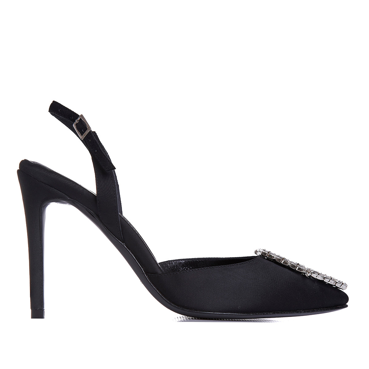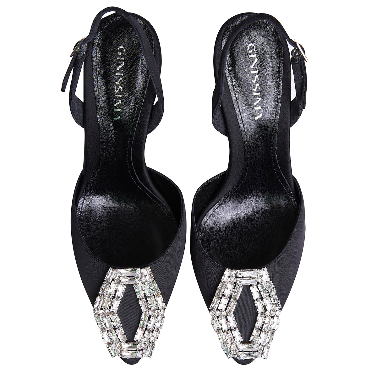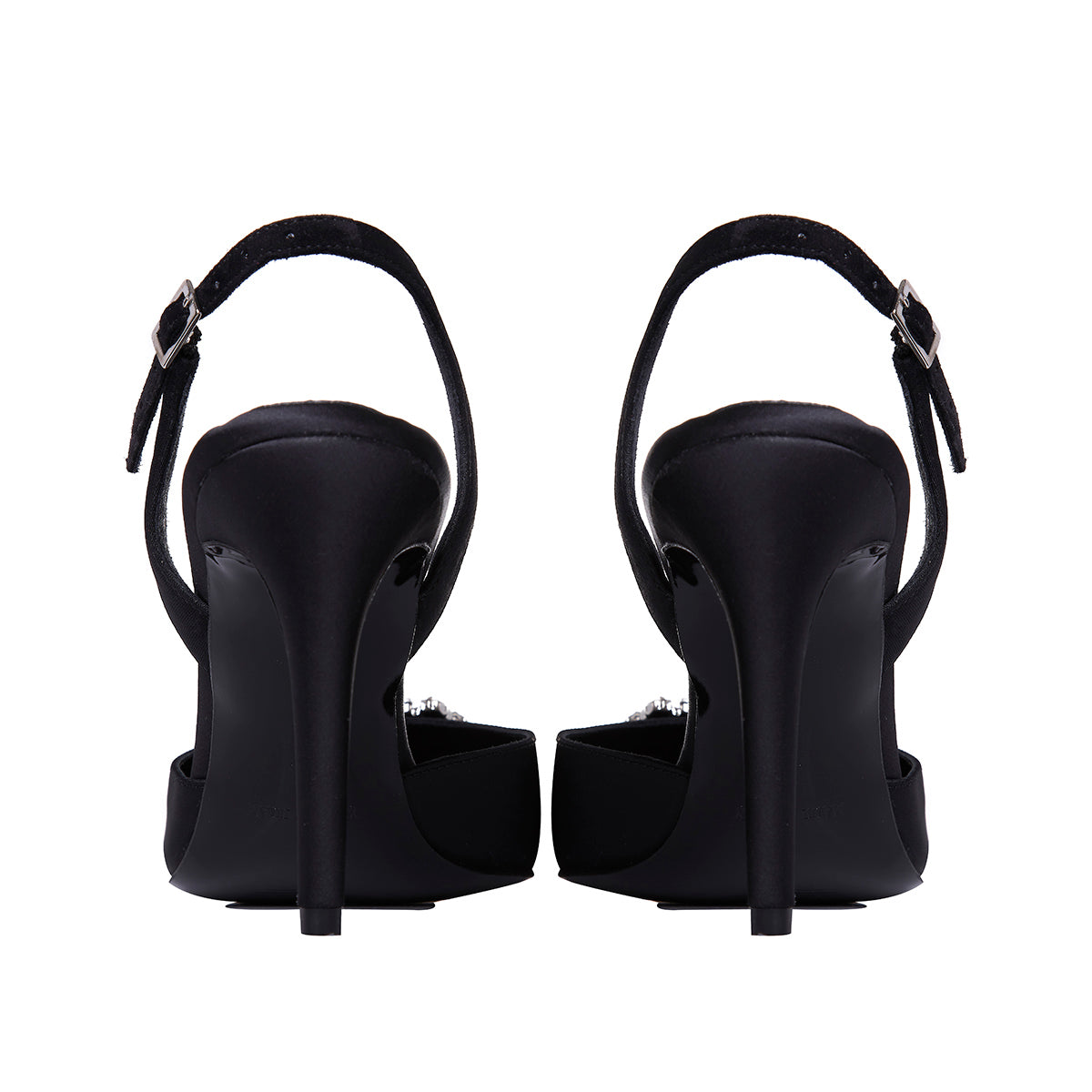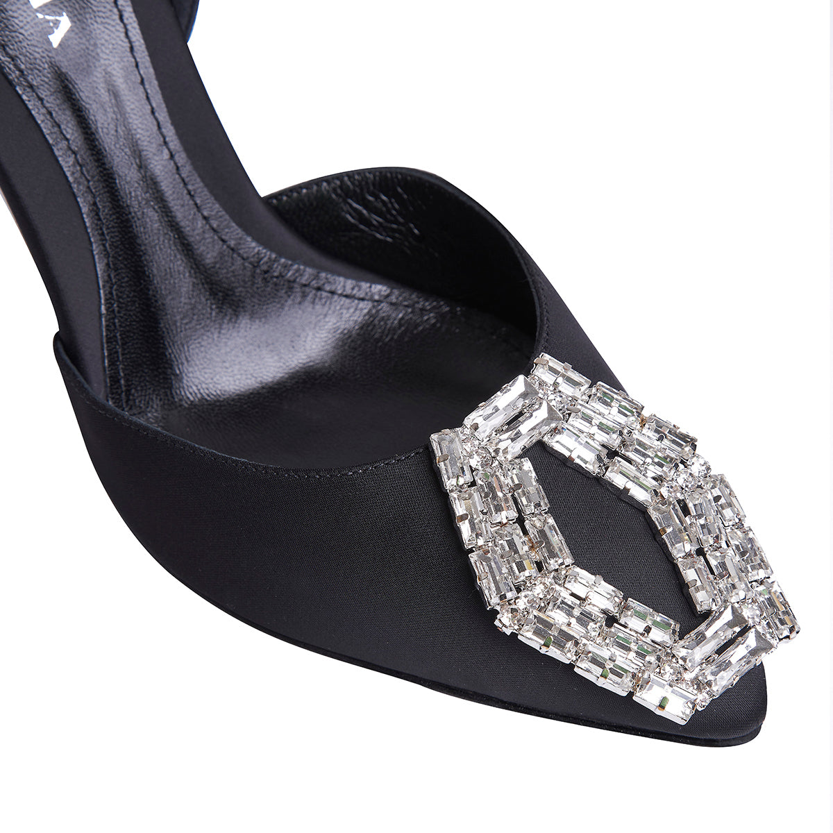 Sandale Alice in editie limitata decorate cu noua brosa in versiunea supradimensionata a rombului nostru de cristale inspirat de operele marelui Brancusi. Acestea sunt realizate din satin negru la exterior si interior din piele naturala neagra.