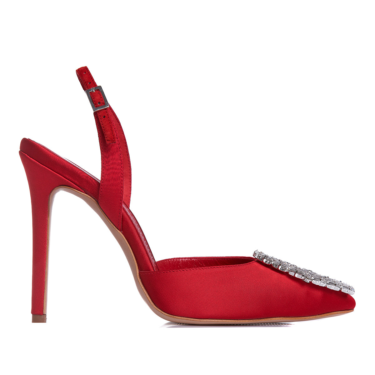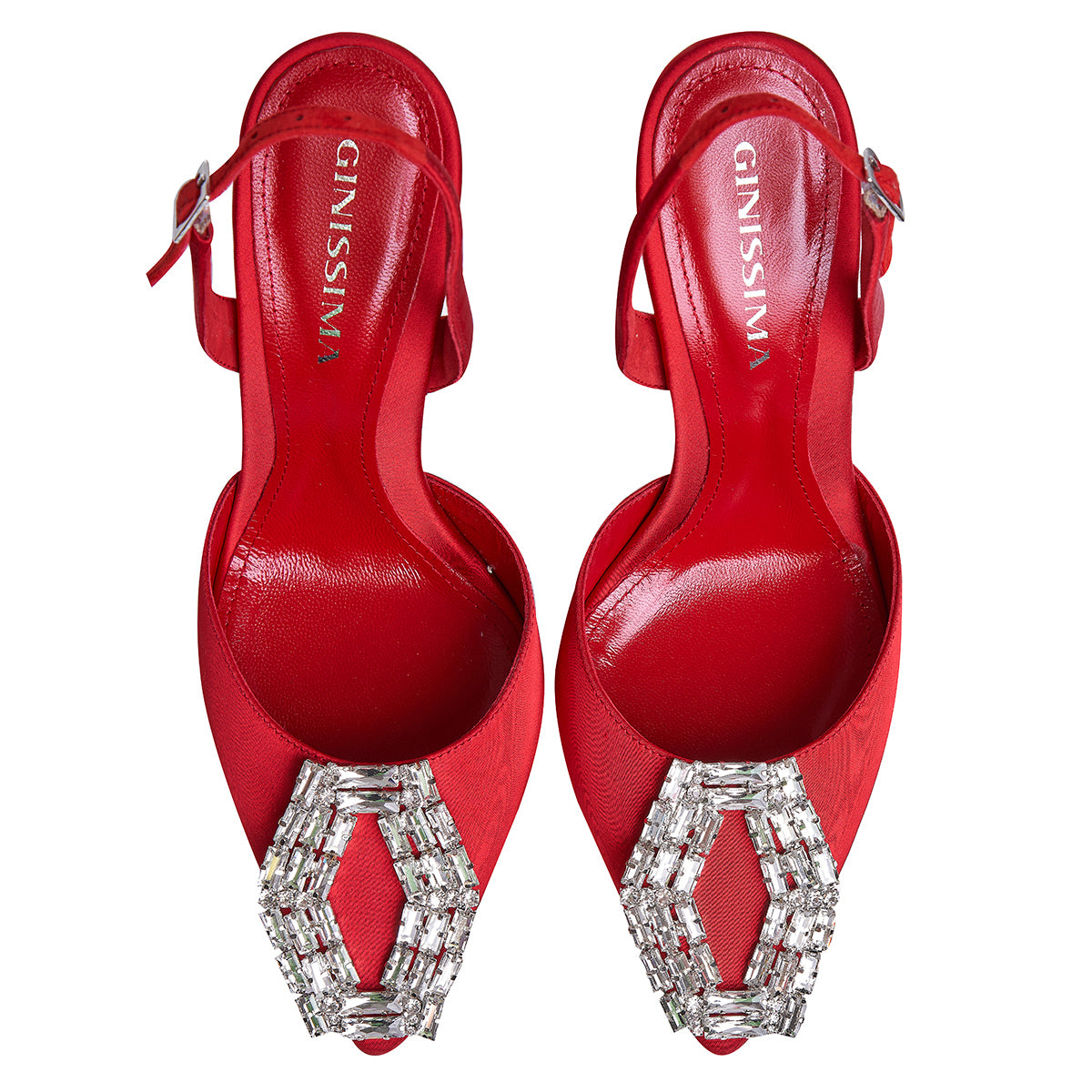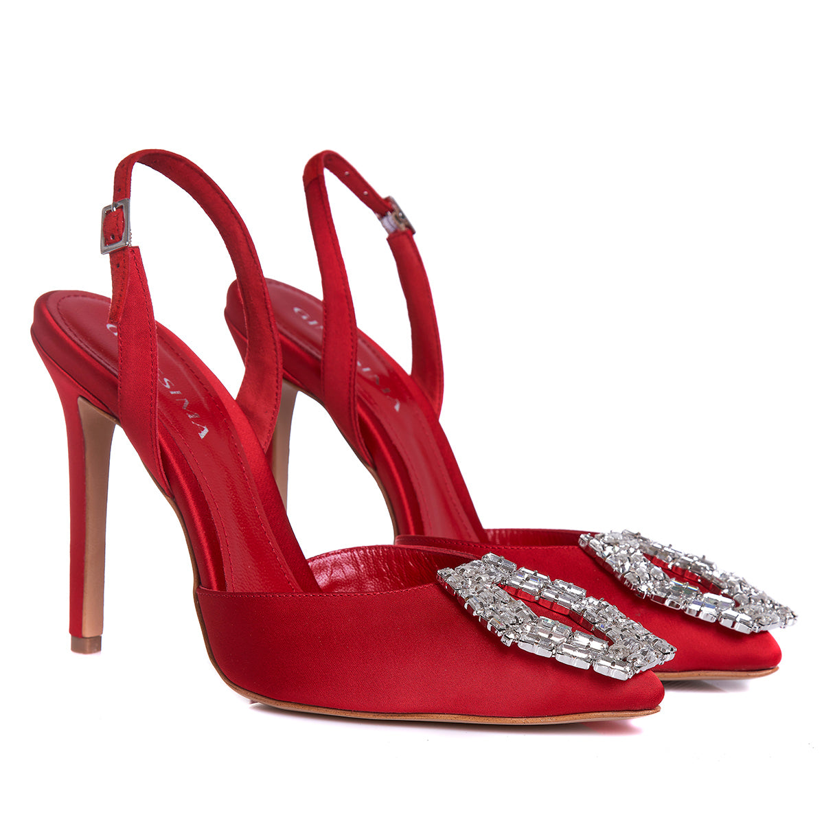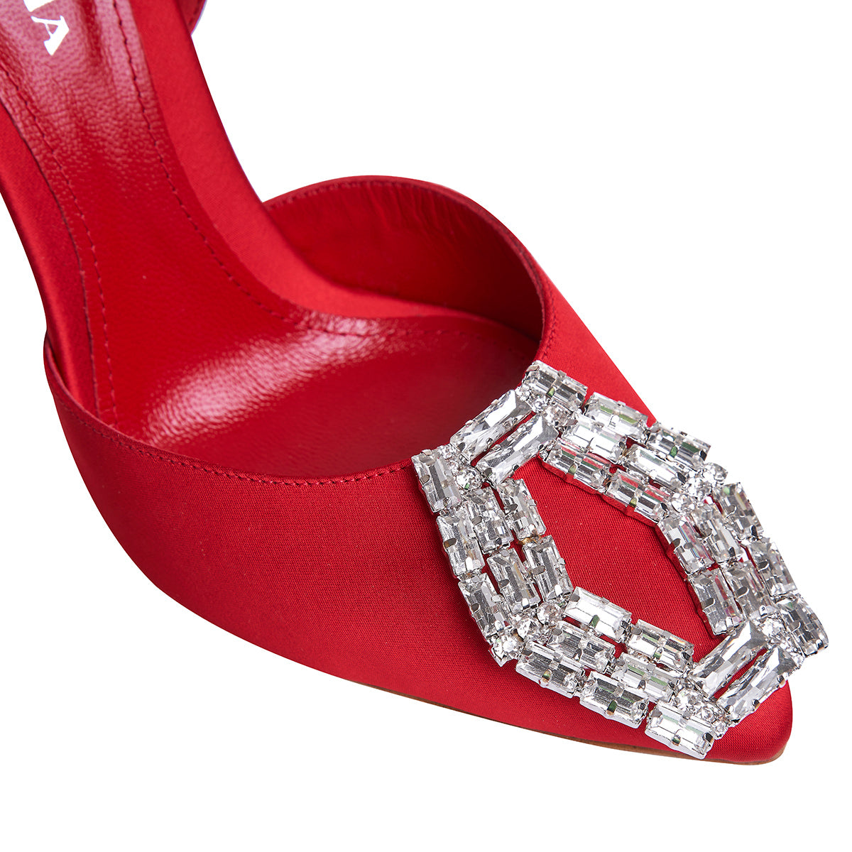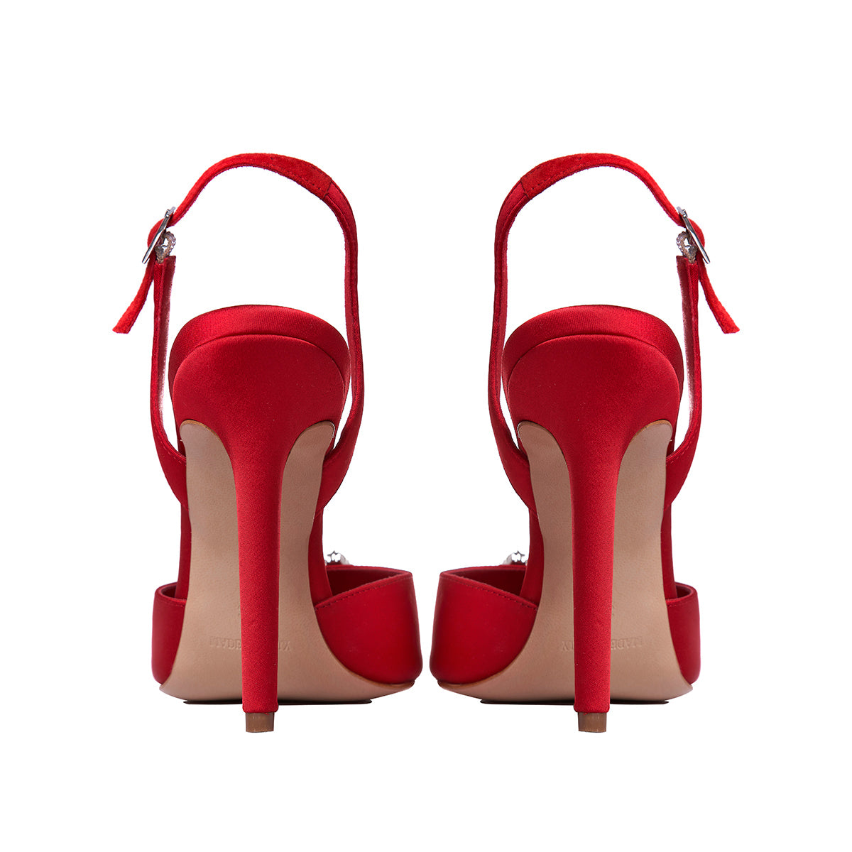 Sandale Alice in editie limitata decorate cu noua brosa in versiunea supradimensionata a rombului nostru de cristale inspirat de operele marelui Brancusi. Acestea sunt realizate din satin rosu la exterior si interior din piele naturala in acelasi ton.