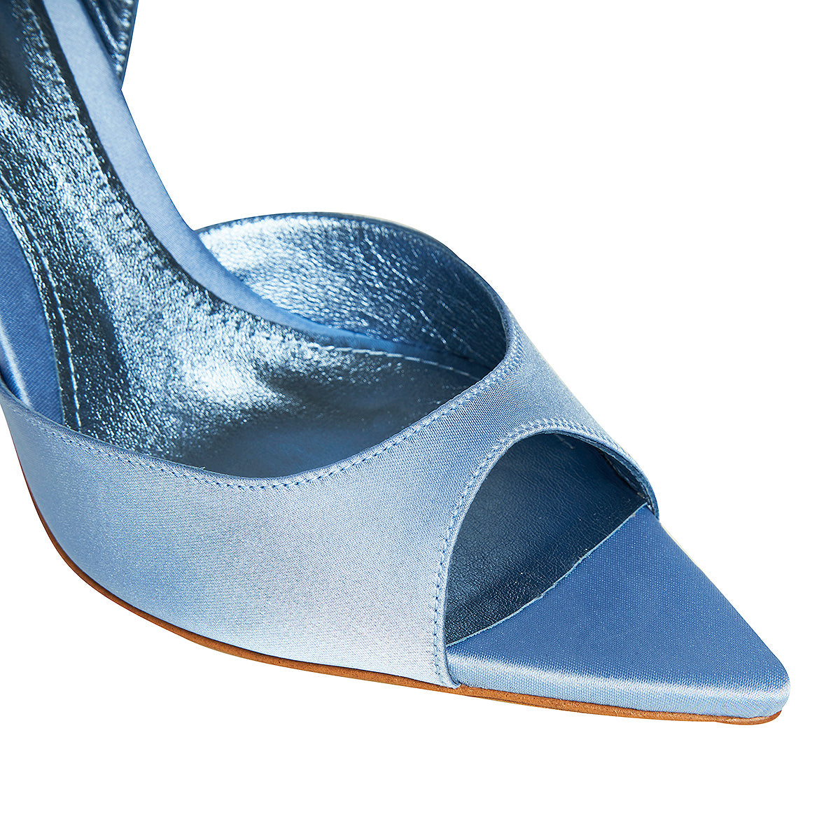 Sandalele Vicky cu varf ascutit completeaza perfect o tinuta de zi sau de seara, fiind realizate din satin bleu la exterior si interior din piele naturala in acelasi ton, pe un toc subtire, iar bareta reglabila de la spate garanteaza o tinuta perfecta si comoda.